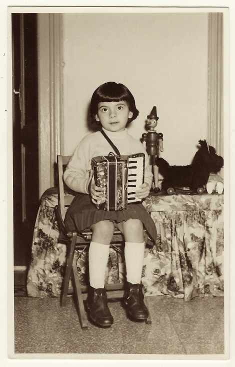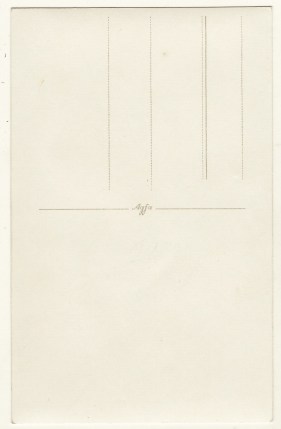 This vintage photo postcard captures a most adorable wide-eyed little girl sitting on a wooden chair and holding an accordion. The girl’s expression is precious. She seems happy to be posing for this photograph. She is sitting in front of a collection of her toys including a nutcracker man, a dog on wheels, and a doll. The accordion has the logo of the Cucciolo company. This company operated in Italy and this postcard is likely of Italian origin and produced in the 1930’s. Printing on the reverse of the postcard indicates that the postcard was published on Agfa postcard paper. Founded in 1867, “Actien-Gesellschaft fur Anilin-Farrikation” (AGFA) produced chemical liquids for photography. In 1913, the company becgan to produce postcard papers. The company’s primary factory was located in Berlin, Germany. (SOLD)