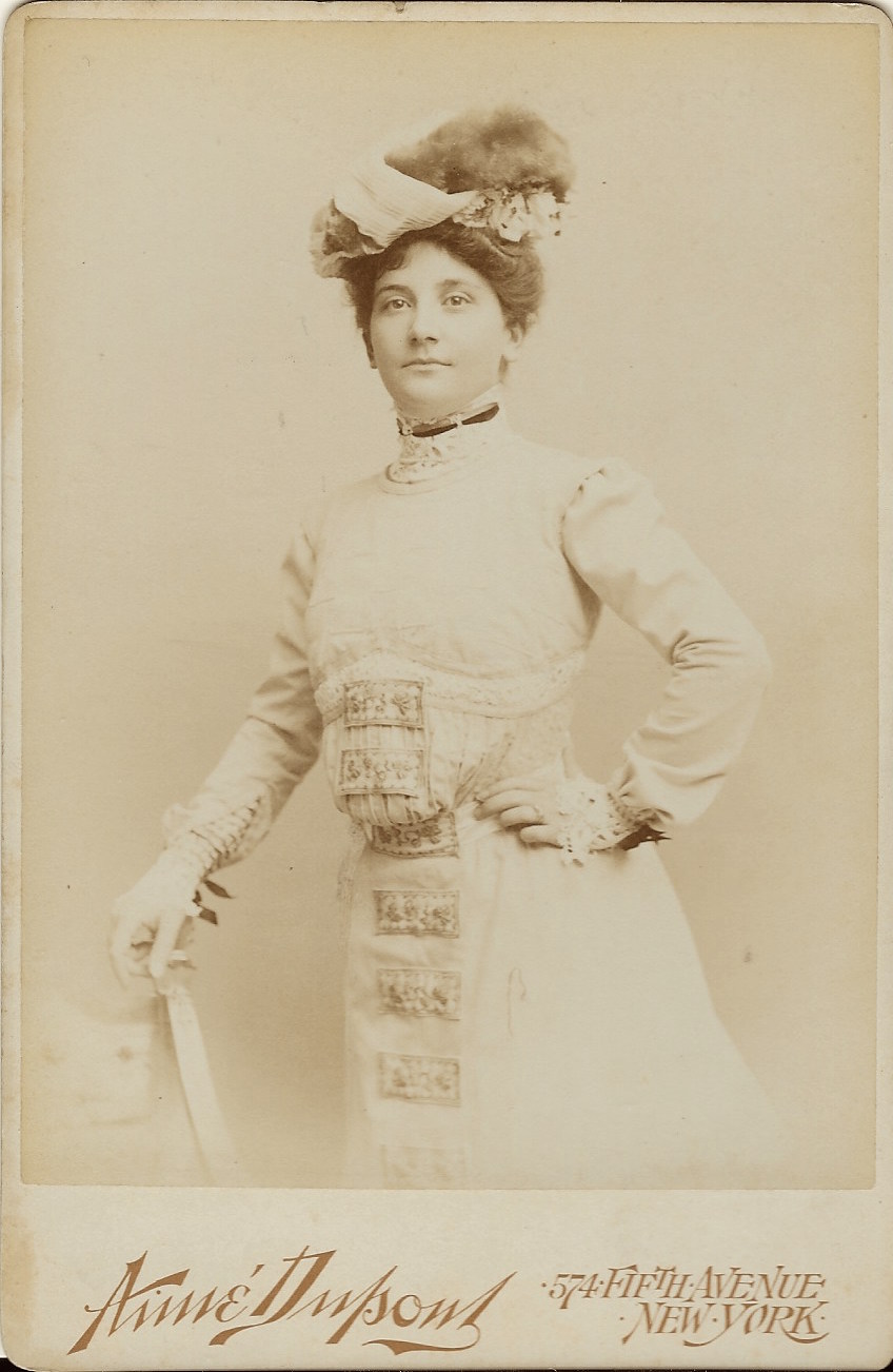 This cabinet card portrait features comic opera star, Helen Bertram (1869-1953). As I researched her life, I became more and more interested in her experiences and character. She was a person who’s life itself was a drama. More on that later. She was one of America’s leading prima donnas of her era. Bertram was born in Illinois. Her father was a wealthy grain merchant. She trained at the Cincinnati College of Music and at age 20 began working as a lead singer for a number of opera companies, including Abbott, Conried, and the Bostonians. In fact, she worked for many opera companies because she tended to switch allegiances when offered better salaries. She had much impact on comic opera. Influential roles in “The Gingerbread Man” and “The Prince of Pilsen” contributed to that impact. The St. Paul Daily Globe (1887) printed a review about a very early Bertram performance with the Abbott company. The review states that she sang with ‘such exquisite art as to win the hearts of her audience”. The article also describes Miss Bertram as a brilliant debutante in opera, and states that she had an “exceedingly handsome face, pretty figure, graceful movement, and sweetness”. Her off-stage life was tumultuous and her scandals were covered closely in American newspapers. Plainly said, her personal life was a disaster. In 1893, news articles revealed that she and actor, Edward Henley, were having an affair. Both were married and their affair caused both of their spouses to file for divorce. At first Bertram denied her extramarital relationship saying “Oh my! Mr Henley has had so many sweethearts, it seems too bad that I should be made the scapegoat for all this.” In 1894, Bertram and Henley announced plans to marry. They were not married long because Henley died. The St. Louis Republic (1901) reported that Bertram had thrown a locket containing Henley’s ashes off a balcony. The rationale for pitching the ashes was that she had fallen in love with another man. Bertram denied tossing the ashen remains of her husband. In 1903 she married her third husband, matinee idol Edward Morgan. He had a sensational history of stormy marriages and relationships. At some point in time, Bertram had a relationship with George d’essauer, a wealthy French nobleman. George got himself into some trouble concerning a forgery scandal. After being indicted, he fled to Europe were he was arrested for other charges. The St. Louis Republic (1905) ran an article about Bertram being taken to court for unpaid bills. She claimed she was bankrupt as the reason for non payment. In 1906, her third husband, Edward Morgan died. He died from a fall in his hotel room, but the coroner theorized that the fall was due to his well known morphine addiction. From 1908 into the 1930’s she announced several retirements only to return to the stage. Later roles included vaudeville and concert tours with provincial orchestras. Bertram also had a movie career and the IMdB lists her as appearing in three movies including “The Lightening Conductor” (1914) and “Rhythm on the River” (1940). Back to the cabinet card seen above. The studio that produced this photograph was the Aime Dupont gallery. Dupont (1842-1900) founded his photography business in 1886 in New York City, New York. He was formerly a sculptor and he was of Belgian origin. His American wife, Etta Greer, was also a photographer. She was well respected for he work as a portraitist of opera singers in Paris, France. She was educated in Paris and spent much of her childhood there. She also met and married Dupont in Paris. The couple was very talented and they became very popular as portrait photographers in New York. Among their society and celebrity clients were many singers who were appearing in New York. After Dupont’s death, his wife, and later his son (Albert), operated the studio. His wife kept the name of the studio the same, after the death of her husband. In 1906, the Metropolitan Opera hired its own official photographer, resulting in diminished portrait work in that sector. The studio went bankrupt in 1920.