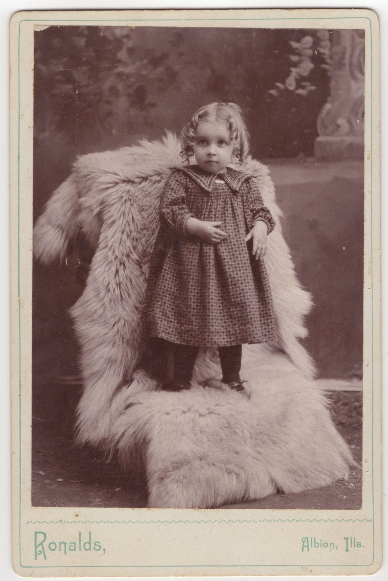 This cabinet card portrait features an adorable little girl standing on a chair covered with a fur throw. She is wearing, a spun dress. This photograph was taken by the Ronald’s studio located in Albion, Illinois. The photo was likely taken sometime between 1880 and 1900. The photographer is likely Frank Ronald. The 1910 census reveals that he was a photographer and lived in Wayne City, Illinois (28 miles from Albion). Photographers of this era often had studios in close together towns. The cabinet card is in very good condition (see scans).