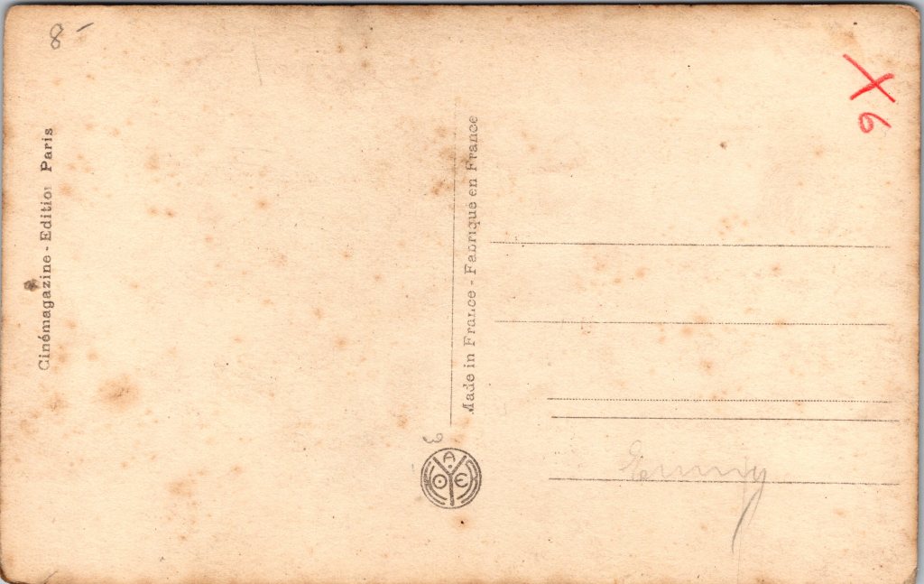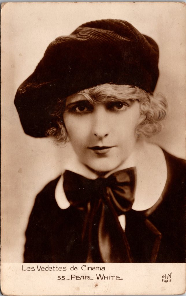 Pearl White (1889-1938) was an American actress of film and stage. She started her career on the stage at just 6 years old in the play, “Uncle Tom’s Cabin”. At thirteen years of age she was a bareback rider for a circus. She dropped out of high school to join a touring stage company. Next she worked as a singer in Cuba and South America. She made her appearances in dance halls and casinos. In 1910, her voice began to fail and she began to appear in silent films, including many popular serials. Her nickname was “Queen of the Serials’. She did the majority of her own stunts in these film serials. She is known well for her role in “The Perils of Pauline”. She was often cast in the role of an athletic heroine, rather than the more typical, innocent young woman. As a result of her appearances in “The Perils of Pauline”, she was soon earning $1,750 per week. She increased her star power as she appeared in other serials. In these films she flew airplanes, raced cars, and did other action hero feats. By 1919 White moved on to more dramatic roles. She appeared in ten drama films for Fox Film Corporation. She finished her career by taking roles in European films, and finally, appearing on the European stage. While performing in London, she earned three thousand dollars a week. At the time of her retirement (1924), White had banked two million dollars. She then began investing. Her investments included a hotel, a night club, and a stable of race horses. White was married twice, each time, for short duration to actors. White died of liver failure, possibly due to her history of heavy drinking. Her drinking may have been attributable to her problems with pain stemming from a spinal injury occurring during her stunt days. The IMDb site credits white with 228 film appearances between 1910 and 1924. This real photo film star photo was published by Cinemagazine (Paris Edition). The card is part of the “Les Vedettes de Cinema” (Stars of the Cinema) series (No.,55). White’s postcard photo portrait was taken by the celebrated photographer, Alfred Noyer. (SOLD)
