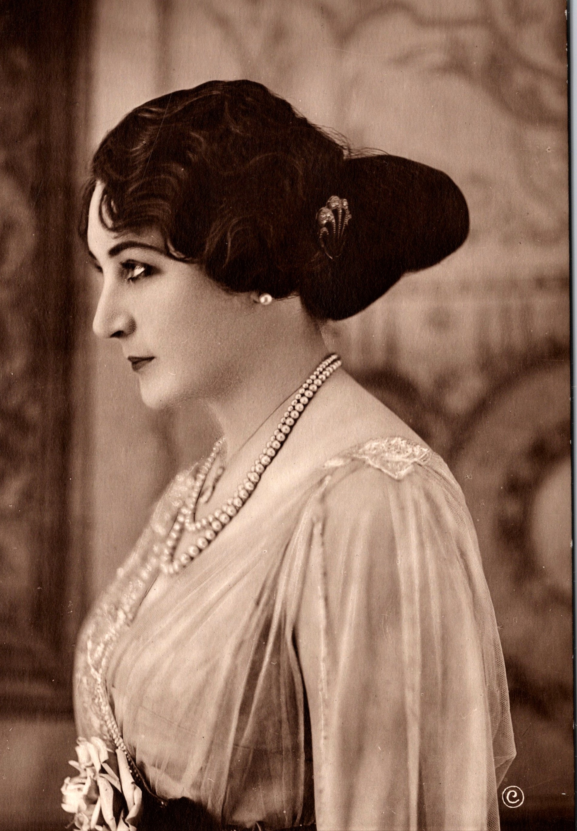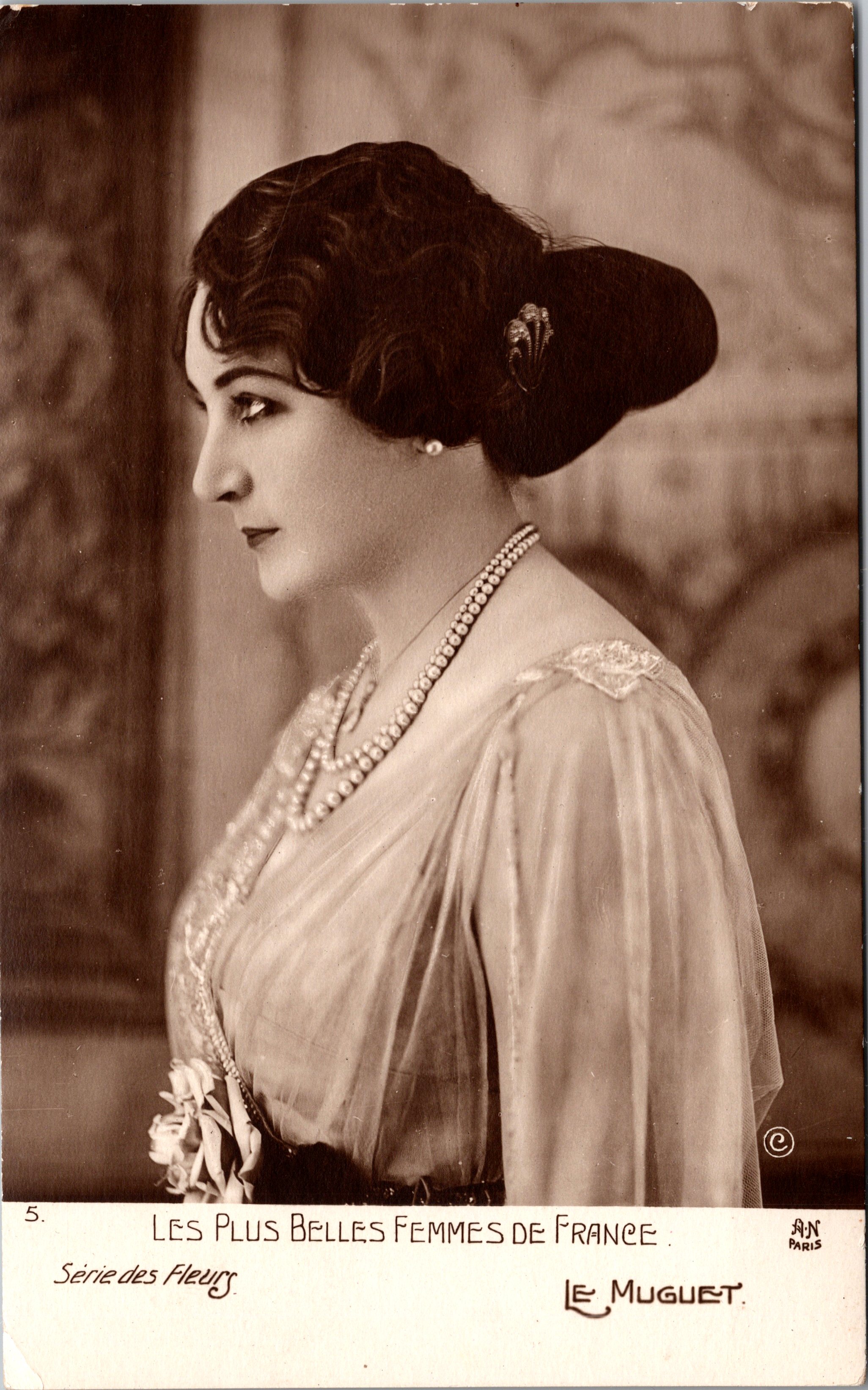This vintage real photo postcard features a profile view of a beautiful model. The postcard is part of a “Most Beautiful Women of France ” series (no. 5). The women in this series each represent different flowers. The model in this postcard represents “Le Muguet”, or “Morning Lillies”. This pretty women ws photographed by Alfred Noyer. His studio was located in Paris, France. This postcard portrait is unposted and in very good condition (see scans).