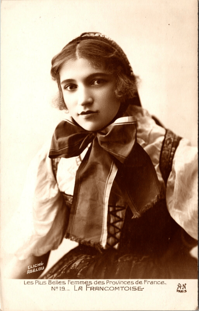 This vintage real photo postcard is part of a series named “Les Plus Belles Femmes de France” (The Most Beautiful Women of France). This series is about the Provinces of France, and the model for this image represents La Francomtoise. This postcard is number 19 in the series. There were a number of different series published. The Province series was one of the more popular series. The models in this series represent different French Provinces and wear traditional clothing from that particular area of the country.This postcard was published by well known photographer Alfred Noyer. The celebrated photographer supervised a large photo studio in Paris. The Noyer Studio operated from 1910 until the 1940’s. Many of his early postcards were reproductions of artworks. He also produced illustrated patriotic postcards during World War I. With the onset of the 1920’s he began producing postcards of children and women. Many of the postcards he produced of women were nudes or risque images. Some of his postcards list his name while others are simply marked “AN”. The photographer of this postcard portrait is Jean Agelou (1878-1921). Agelou was a French photographer of the 1910’s and 1920’s who is best known for his erotic and nude photographs. He was born in Egypt and not much is known about his private life. Agelou generally used models between the age of 20 and 24 years-old. He had a favorite model. Her name was “Fernande” and in addition to modeling, she was Agelou’s lover. Her full name was Fernande Barrey (1893-1960). She was a prostitute by trade. She also modeled for for painters (Amadeo Modigliani and Chaim Soutine). Fernande later became a painter. Although the 1900’s was the “golden age” of erotic photograph, photographers who took such risque photos had to use discretion. As a result, Agelou signed his work “JA”. In 1908, nudity in photographs was banned in France and photographers had to cover nude women images with strategically placed undergarments or other materials. Nude images had to circulate on the down low. They were sent in the mail inside of envelopes. Fernande remained popular and her erotic photographs were enjoyed by soldiers on both sides during World War I. Jean Agelou died in 1921; the result of a car accident. His brother George, who managed Jean’s business, also was killed in the crash. SOLD