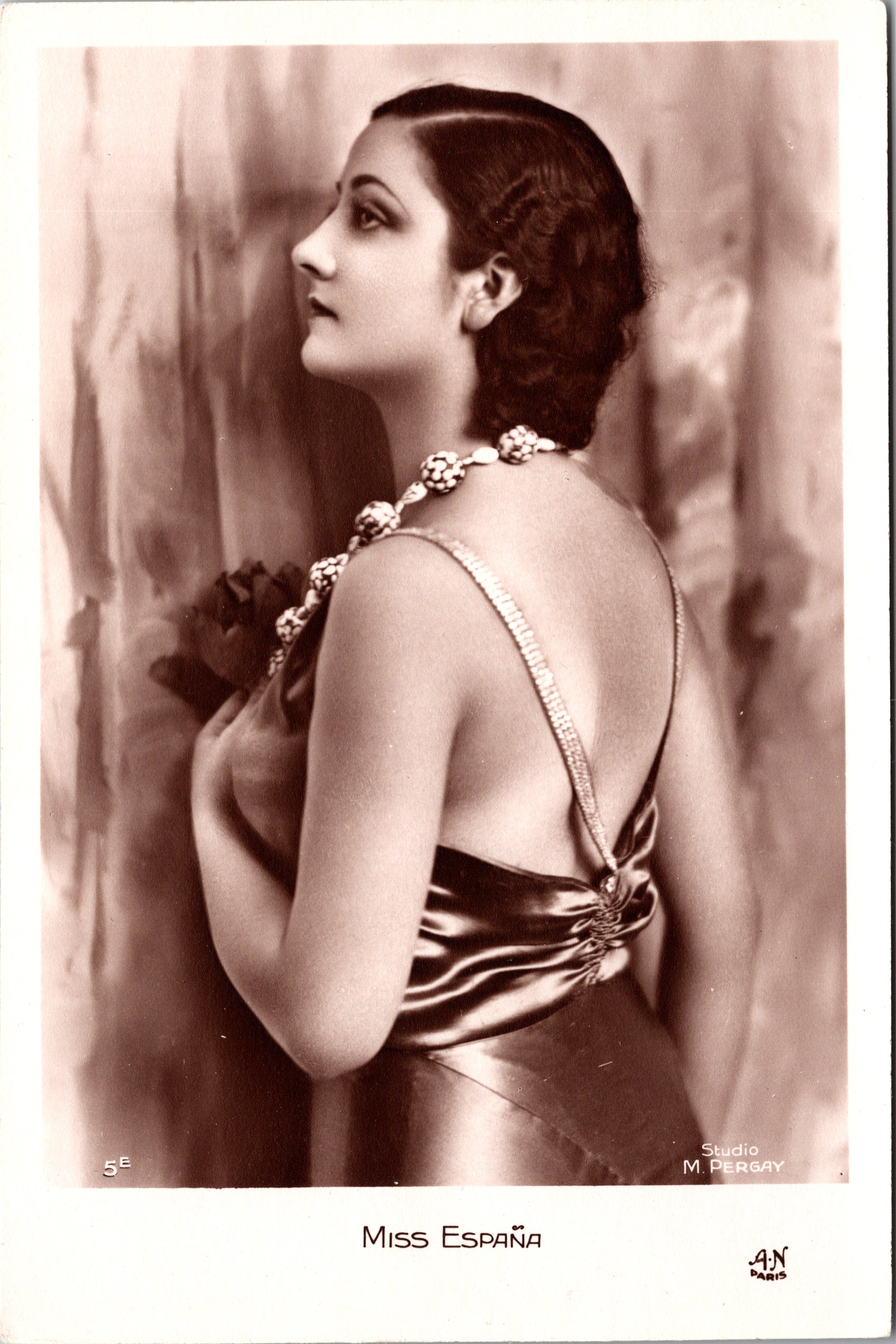 The pretty young woman seen in this vintage real photo postcards is a contestant in one of the early 1930’s Miss Europe beauty contest. She represented Spain in the competition.The Miss Europe contest was established by a French journalist in 1927. Most of the women in this event had won their own country’s national beauty contest, and used the Miss Europe contest as a warm-up for the Miss World pageant. This postcard was published by the well known and acclaimed photographer, Alfred Noyer. His Paris studio operated between 1910 and the 1940’s. Miss Spain’s portrait was photographed by the studio of M. Pergay. (SOLD)