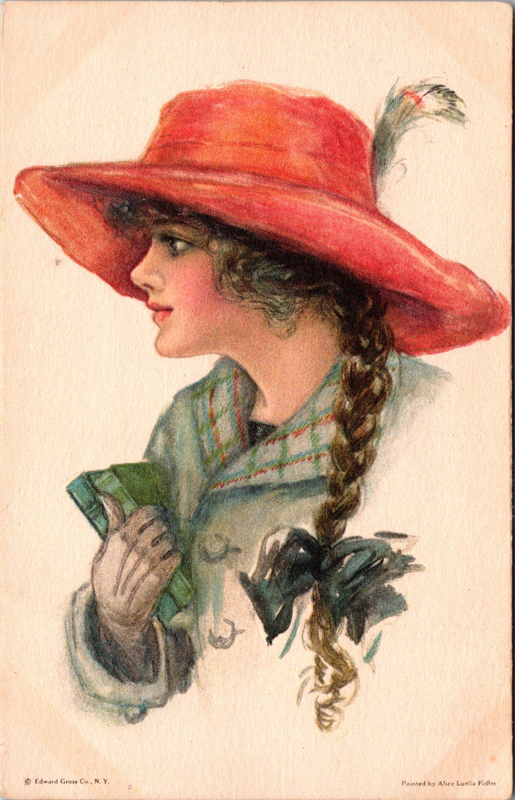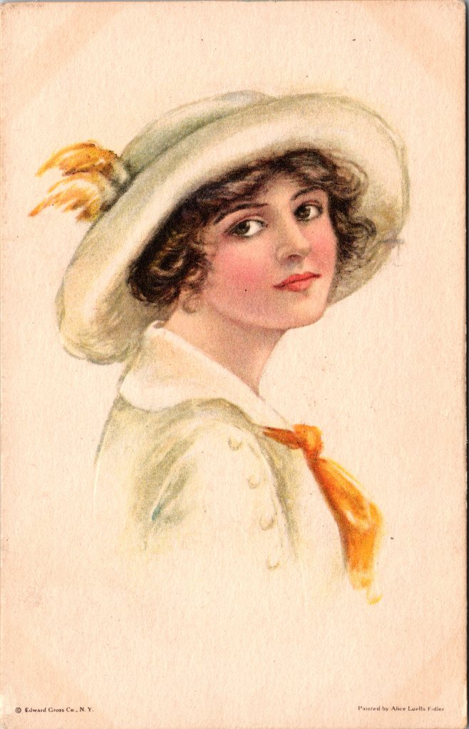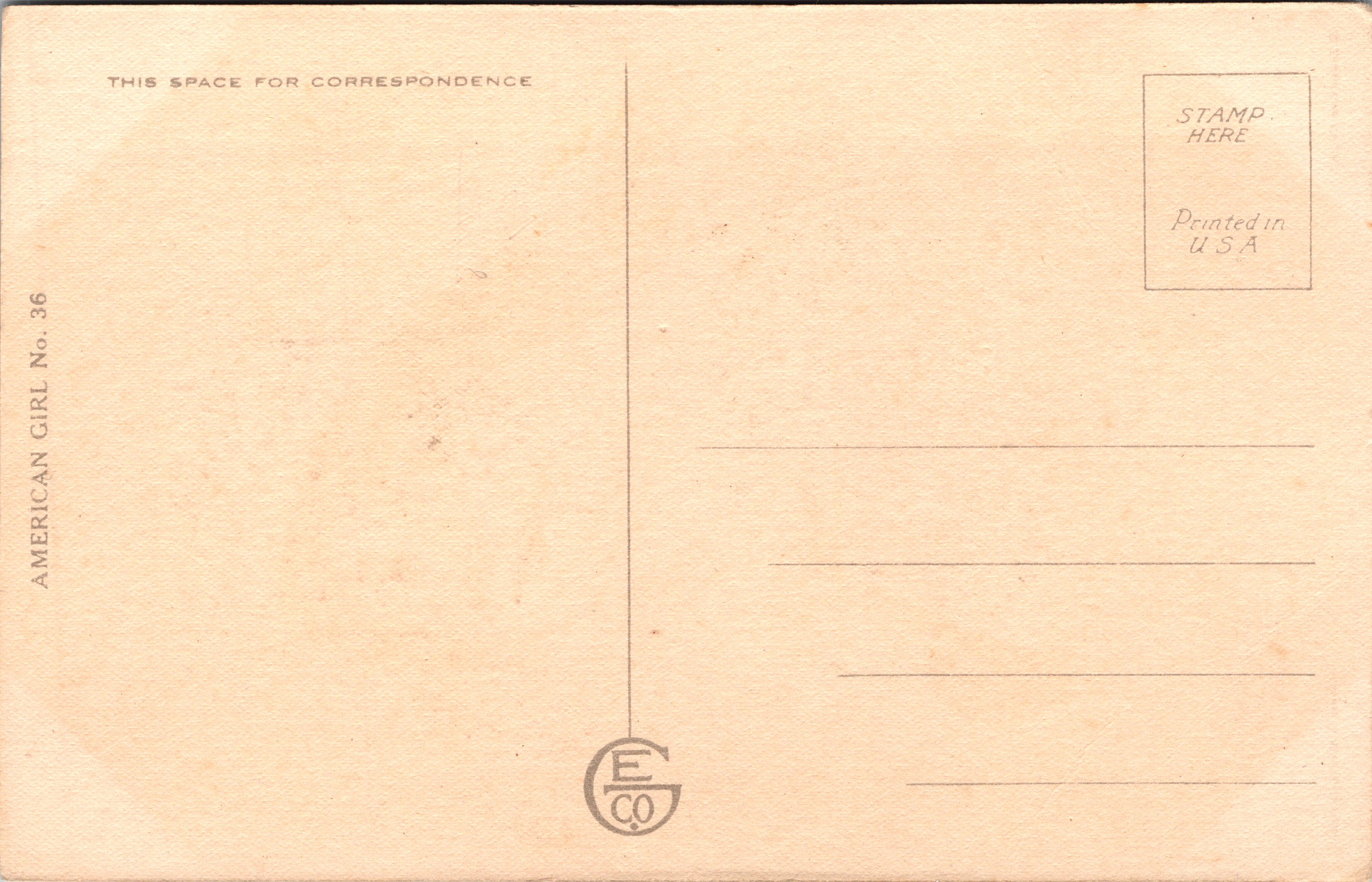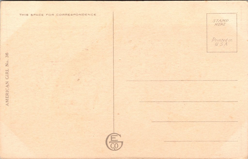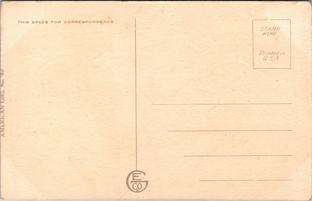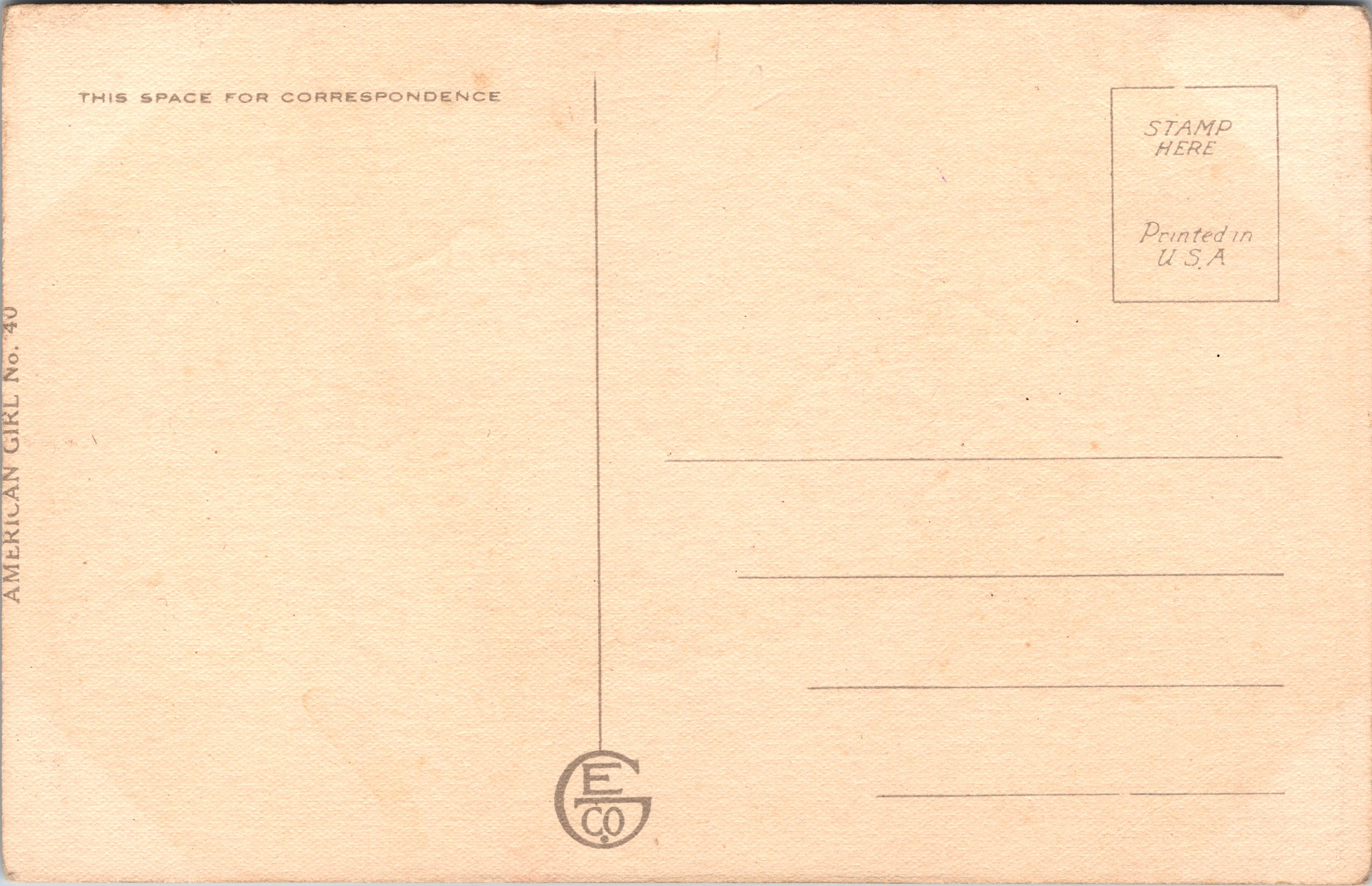 This undivided back vintage printed postcard features a pretty young woman holding a lacrosse stick and wearing a Harvard Sweater. The artist The artist has created a fun postcard with vibrant colors. The artist of this card, Alice Luella Fidler (1883-?), is well known and famous for her talent. In the early twentieth century, Alice and her two sisters, Pearle Eugenia Fidler LeMunyan (1880-?), and Elsie Catherine Fidler (1892-?); specialized in creating drawings of beautiful girls and women. This postcard is from the “College Lad and Lassie” series, produced in 1906. The sisters were wonderful illustrators and most of their drawings were published as postcards. This postcard was published by M. T. Myers & Son. The card was postmarked in 1908. SOLD