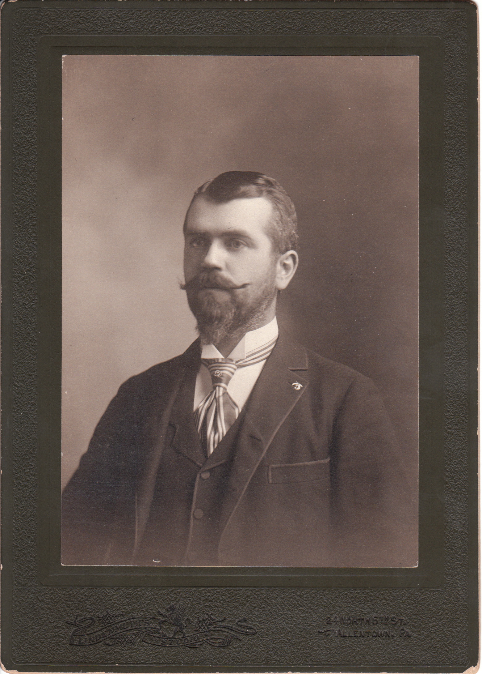 A handsome well dressed and devilish looking man poses for his portrait at Lindenmuth’s studio which was located at 24 North 6th Street in Allentown, Pennsylvania. He looks terrific in his three piece suit and his well groomed beard and handlebar mustache. Writing on the reverse of the photograph dates the image as being produced in 1899. The photographer of this portrait is primarily known for his work as an artist. Arlington Nelson Lindenmuth (1856-1950) was an American landscape and portrait painter who lived and painted in Allentown and the Lehigh Valley region of Pennsylvania. The Pennsylvania native was a member of the “Baum Circle”., the group of artists either were taught by or influenced by Pennsylvania impressionist painter, Walter Emerson Baum. Lindenmuth was also one of the earliest professional photographers in the Lehigh Valley area. He opened his first studio in Allentown in 1881. Prior to that, he operated studios in Tamaqua, Philadelphia, and Pottstown. All three cities are in Pennsylvania. As early as 1862, Lindenmuth was also employed as a traveling sales representative for Eastman Kodak. To view other photographs by Lindenmuth, click on the category “Photographer: Lindenmuth”.