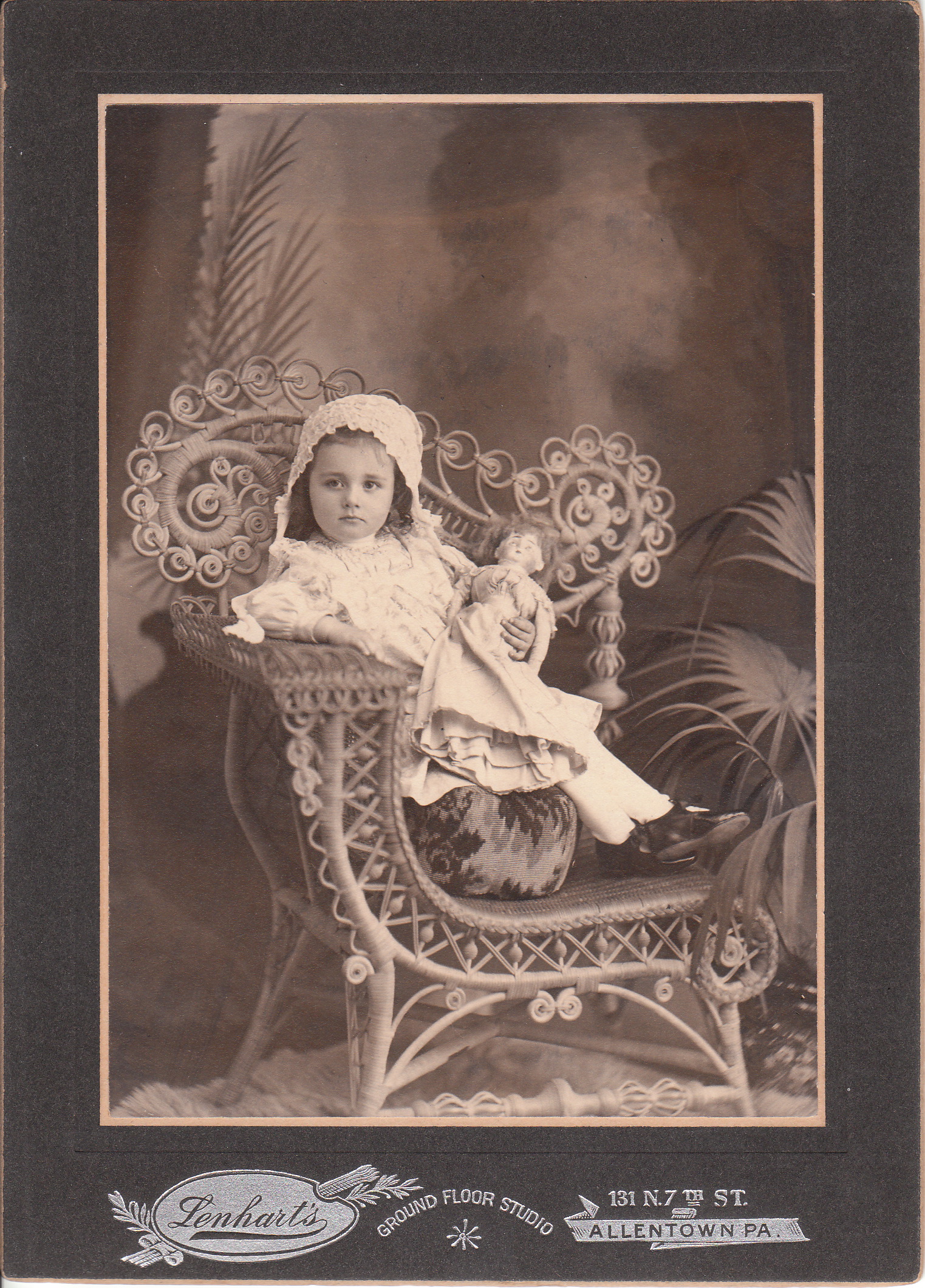An adorable little girl poses for her portrait at Lenhart’s Studio in Allentown, Pennsylvania. She is wearing a cute bonnet and is clutching her prized doll. A look at her eyes reveals that she is taking in the entire scene around her. She is sitting on a large cushion on what appears to be a wicker chair. To view other images by Thomas Lenhart and to learn more about him, click on the category “Photographer: Lenhart”.