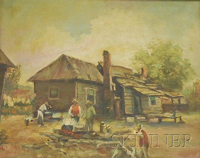 A woman poses for her portrait at the Lindenmuth Studio in Allentown, Pennsylvania. She likely viewed her self as foremost, a musician. She chose to pose herself, or approved the photographers instructions, to pose sitting and holding her violin and bow. The photographer, Arlington Nelson Lindenmuth (1856-1950) is a noted American landscape and portrait painter. He worked in Allentown which is located in the Lehigh Valley area of Pennsylvania. He was a member of the Baum Circle which was a group of artists who were influenced by the work of Pennsylvania impressionist painter Walter Emerson Baum. Lindenmuth studied painting under Peter Alfred Gross and also in Europe. His paintings were exhibited in Philadelphia and New York City. He also painted a number of murals which still can be seen in a number of Allentown’s buildings. Lindenmuth is also known as one of the pioneer photographers in the Lehigh Valley. He operated a photography studio in Allentown for a number of decades. Interestingly, in addition to running a photography business, Lindenmuth taught art from his photography studio. In 1882 he worked for the Eastman Kodak Company as a traveling salesman. He was a great advocate of art appreciation. He was a proponent for the Allentown Art Museum. One of his sons, Raphael Tod Lindenmuth, had much success as an artist. Below is an example of a painting by Arlington Nelson Lindenmuth. To view other photographs by Lindenmuth, click on the category “Photographer: Lindenmuth”. This cabinet card portrait is in excellent condition (see scans).