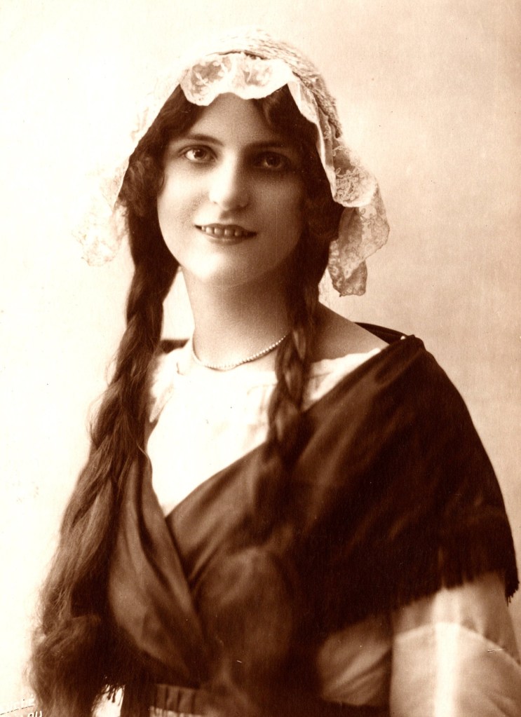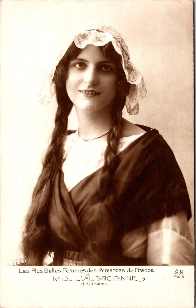 This color tinted vintage real photo postcard features a pretty young Alsatian woman with a large bow in her hair. She is wearing a cross and has lots of flowers pinned to her dress near her neckline. What’s an Alsatian you may wonder. Alsatians are an ethnic group of people who live in the Alsace region of France. They are settled between the Vosges Mountains and the border of Germany. This French postcard was published by Fauvette as part of a series (No.1023). SOLD