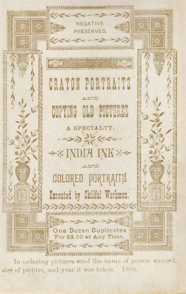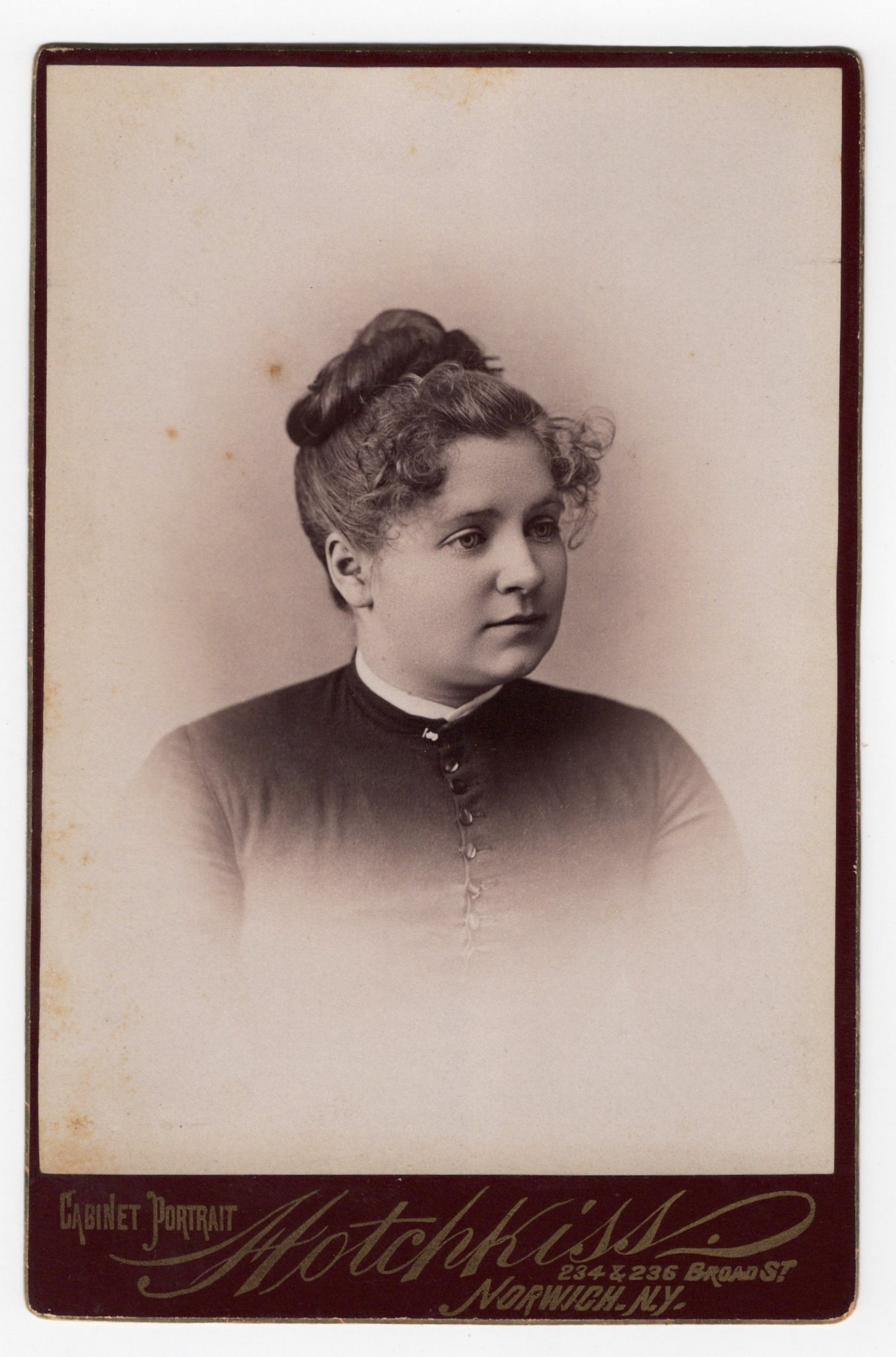 This cabinet card portrait features a well dressed young man and young woman. Are they husband and wife or are they siblings. The pair look quite young to be married, but it certainly is possible that they are a wedded couple. The woman is wearing a cross and a collar pin. Her dress is very stylish. The young man is wearing a fashionable hat, a pocket watch, and has a handkerchief peeking out of his sport jacket’s top front pocket. He is holding a long stick. It is too thin to be a cane. Perhaps it is a crop used to control horses. I would appreciate some help from cabinet card gallery visitors to identify what exactly the gentleman is holding. An inscription on the reverse of the photograph identifies the subjects as “Emory and Effie in their younger days”. The note adds that at least, one of the pair, were married at age 20. I have difficulty resisting a challenge so I became determined to further identify this lovely couple. I am uncertain if I succeeded. Effie Mae Lafler (1875-1955) married Emory Grant Speers (1869-1964) in 1894. They were married in Canandaigua, New York. Effie was about 20 years old at the time of her marriage, which is consistent with the inscription. The pair had three children. Emory was a farmer. Before I could congratulate myself on a job well done, I realized that there was “a fly in the ointment”. Printed on the bottom of the reverse of the photo is the date 1884. If this is the date that the photograph was taken, Effie would have been nine years old. Clearly, she is much older than 9 in the photograph. However, the photo could have been made on old card stock, and that accounts for the date discrepancy. Although there is uncertainty about the identification of this couple, I was able to learn much about the photographer of this image. The photographer of this cabinet card is Alston E. Hotchkiss ( c 1846-1907) of Norwich, New York. A. E. Hotchkiss came to Norwich in 1872 at the age of twenty-six. He ran the most popular photo gallery in town and it is reported that he took on the persona of an artistic and cultured gentleman. His wife played a major role in his running the studio and at one point, he employed at least twenty workers. At this point in time, the Cabinet Card Gallery has three other photos by this excellent photographer. This trimmed photograph is in very good condition (see scans).