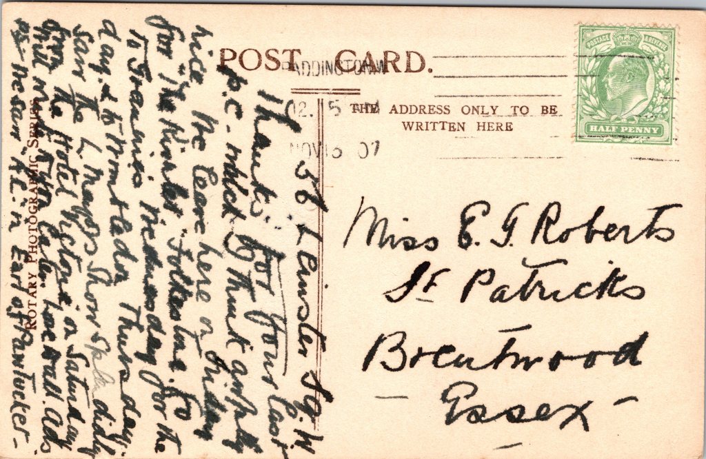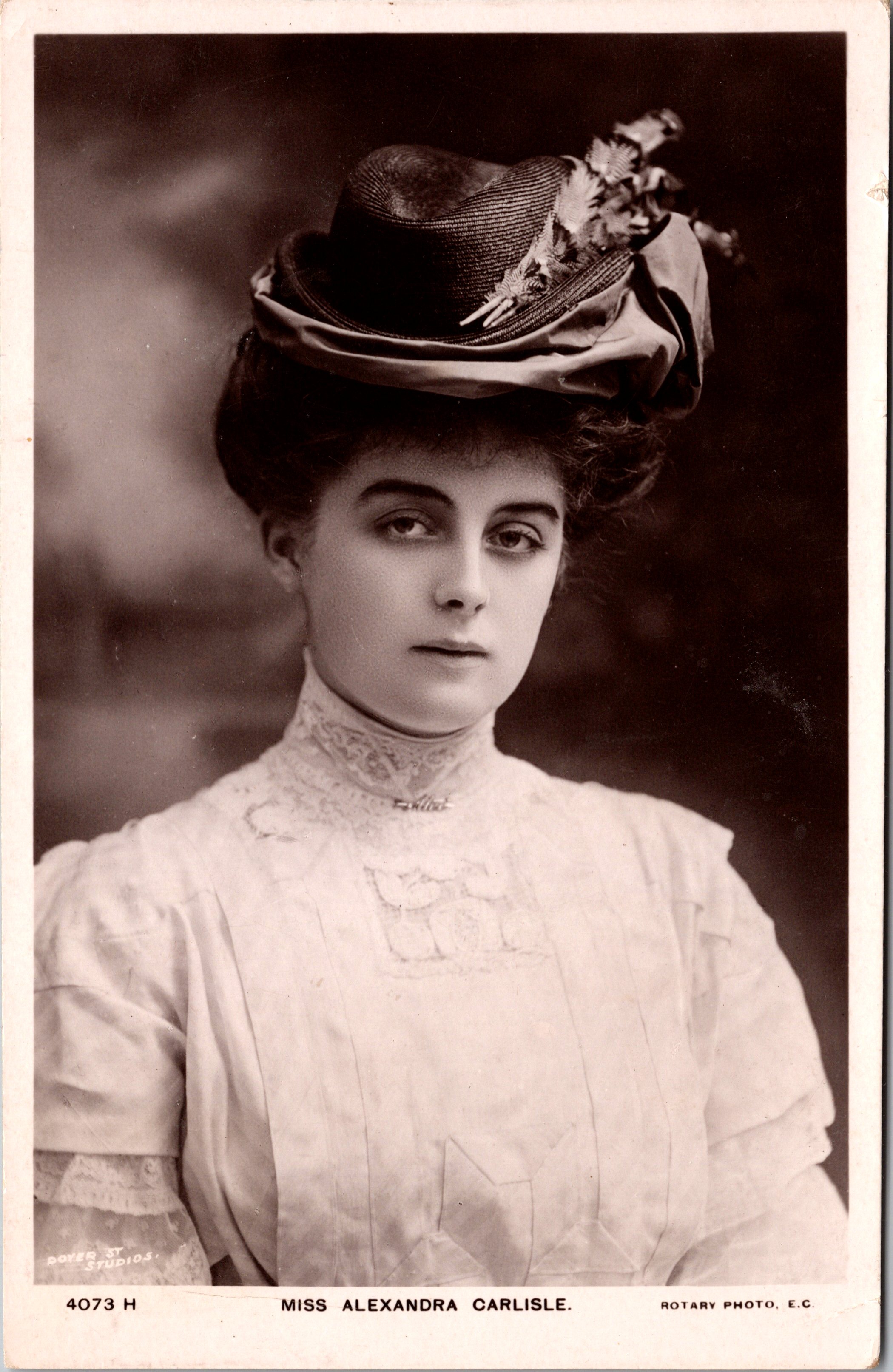 Postcard 1 features pretty stage and film actress Alexandra Carlisle (1886-1936). She is wearing a feathered hat and a sullen expression. Carlisle was an English actress as well as a suffragest. She was born in England. In 1903 she performed in two Shakespearian productions. In 1908, she performed the lead role in “The Mollusc” at the Garrick Theatre. IN 1908 she appeared in two productions of Shakespeare plays produced by Herbert Beerbohm Tree. In 1911, she acted in a Royal Command Performance for King George V and the Emperor and Empress of Germany. In 1912, she married for the third time. Her new husband was a dental surgeon from the US and in 1915 she settled there. She quickly became a noted speaker for women’s suffrage and for the Republican Party. In 1920, she directed a show for Harvard’s Hasty Pudding Club. Also in 1920, she was the main speaker for Massachusetts at the Republican Convention and she seconded the nomination of Calvin Coolidge for Vice President. Carlisle performed in two films (1917,1934). She was an active Broadway performer; performing in 17 Broadway productions between 1908 and 1936. The writer of this postcard mentions Miss Carlisle. She states that “we saw A. C. in Earl of Pawtucket”. This postcard was published by Rotary Photo as part of a series (no. 4073 H). Carlisle’s phototgraph was taken by Dover Street Studios. The postcard is postmarked 1907 and has a British stamp. (SOLD)