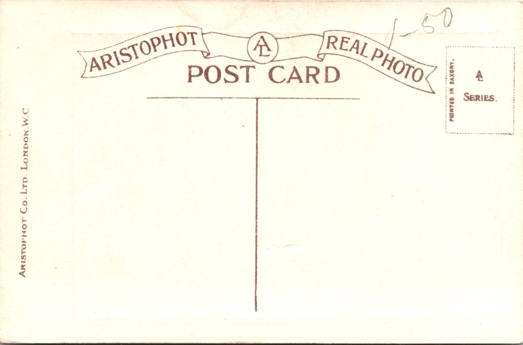 This vintage real photo postcard features actress, Enid Leslie. Her photo was taken by the talented female celebrity photographer, Rita Martin. There is not much biographical information about this performer that is readily available on the internet. However, it is clear that she was an active performer. Theatricalia list 6 London stage appearances for Miss Leslie. The plays were performed between 1909 and 1913. A photograph of Leslie and Nina Sevening can be seen on the front page of “The Illustrated Sporting News” (1908). The IBDd reports that she appeared in two Broadway plays between 1883 and 1912. The Tatler (1916) describes Leslie as a “charming actress”. This postcard was published by Aristophot (London). The company ceased to exist when it was purchased by Iris Verlag (Austria) in 1909. SOLD