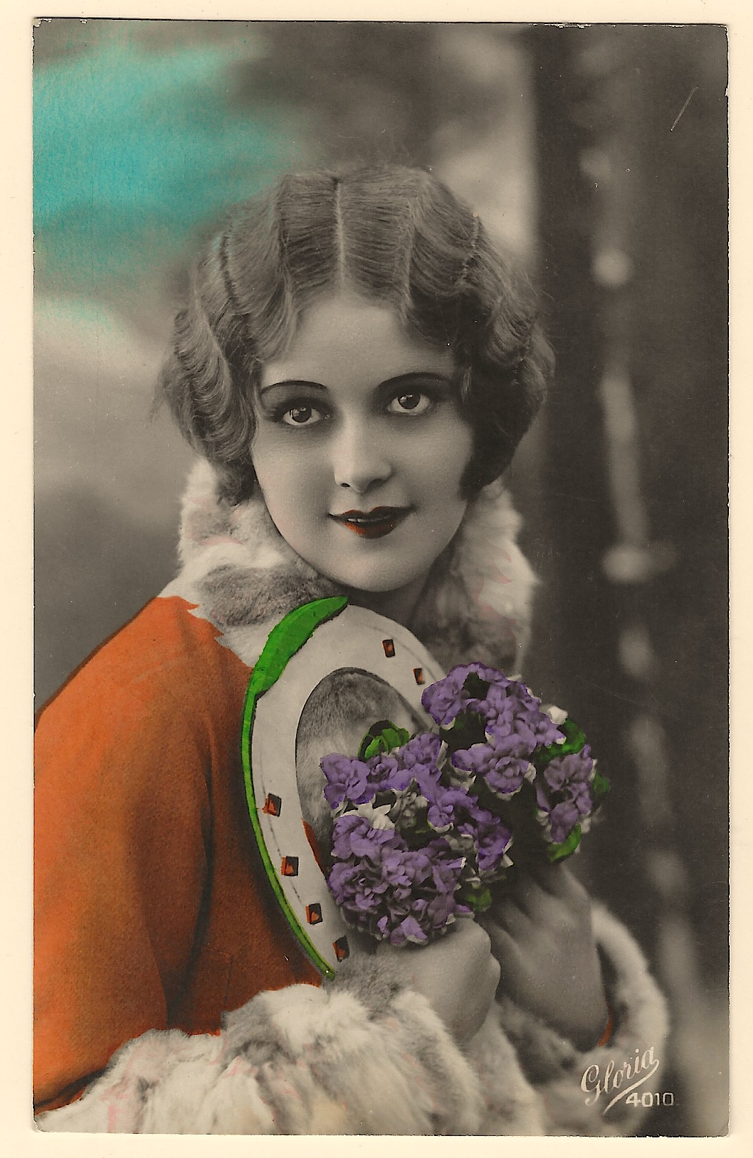 This vintage real photo postcard features a very attractive young woman holding a bouquet of purple flowers and what appears to be a horseshoe. The woman is beautifully dressed in an orange winter coat with a fur collar and fur sleeve cuffs. She has a wonderful smile. The postcard is from the French art deco period. It was likely published in the 1910’s. The postcard was published by Gloria and was part of a series (no. 4010). The horseshoe seen in this photograph is an enigma. First of all, is it a horseshoe? It is way too large to be anything but a piece of art, rather than a real horseshoe. Horseshoes have long been associated as being “lucky”. They were originally made of iron, a metal that was believed to ward off evil spirits. They were originally held in place with seven nails. Seven was considered a lucky number. Superstitious sailors believed a horseshoe nailed to a mast would keep storms away from their ship. This postcard is in excellent condition (see scans).