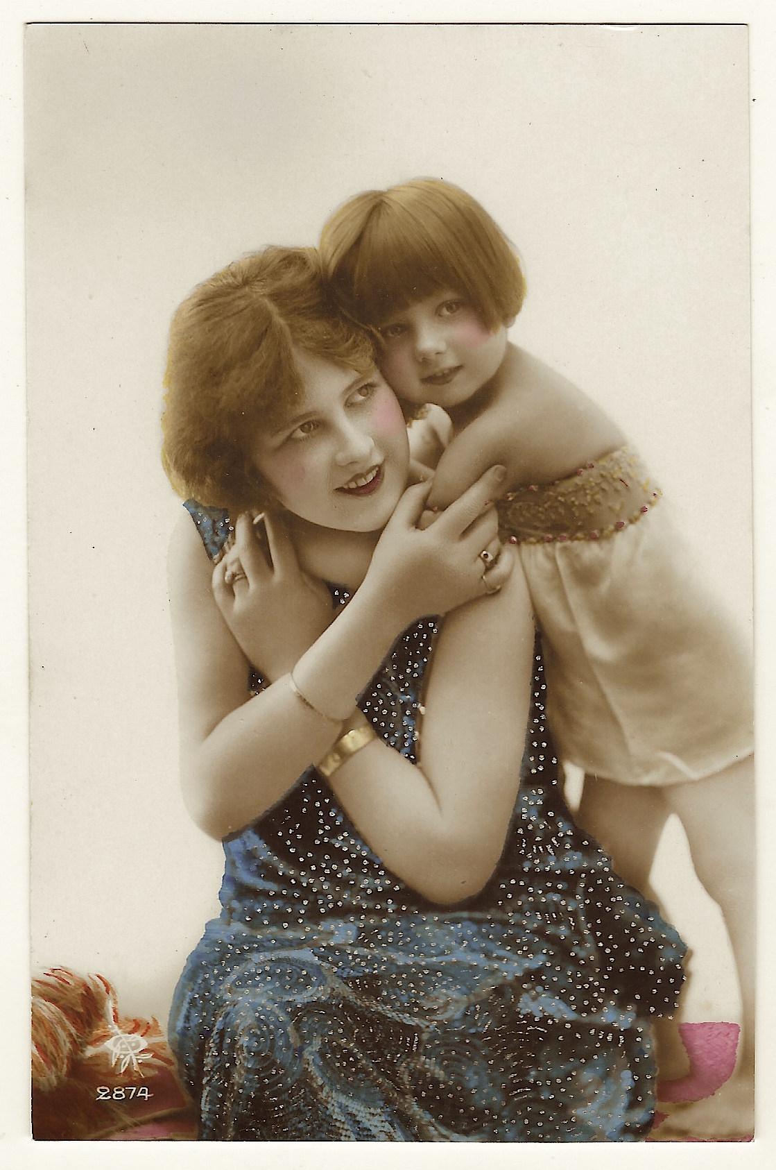 This vintage real photo postcard features of an art deco portrait of a beautiful mother and her adorable daughter. This postcard is French in origin and it has an art deco style. The photo postcard is likely from the 1920’s and highlights fashion of that time. The postcard is in excellent condition (see scans).