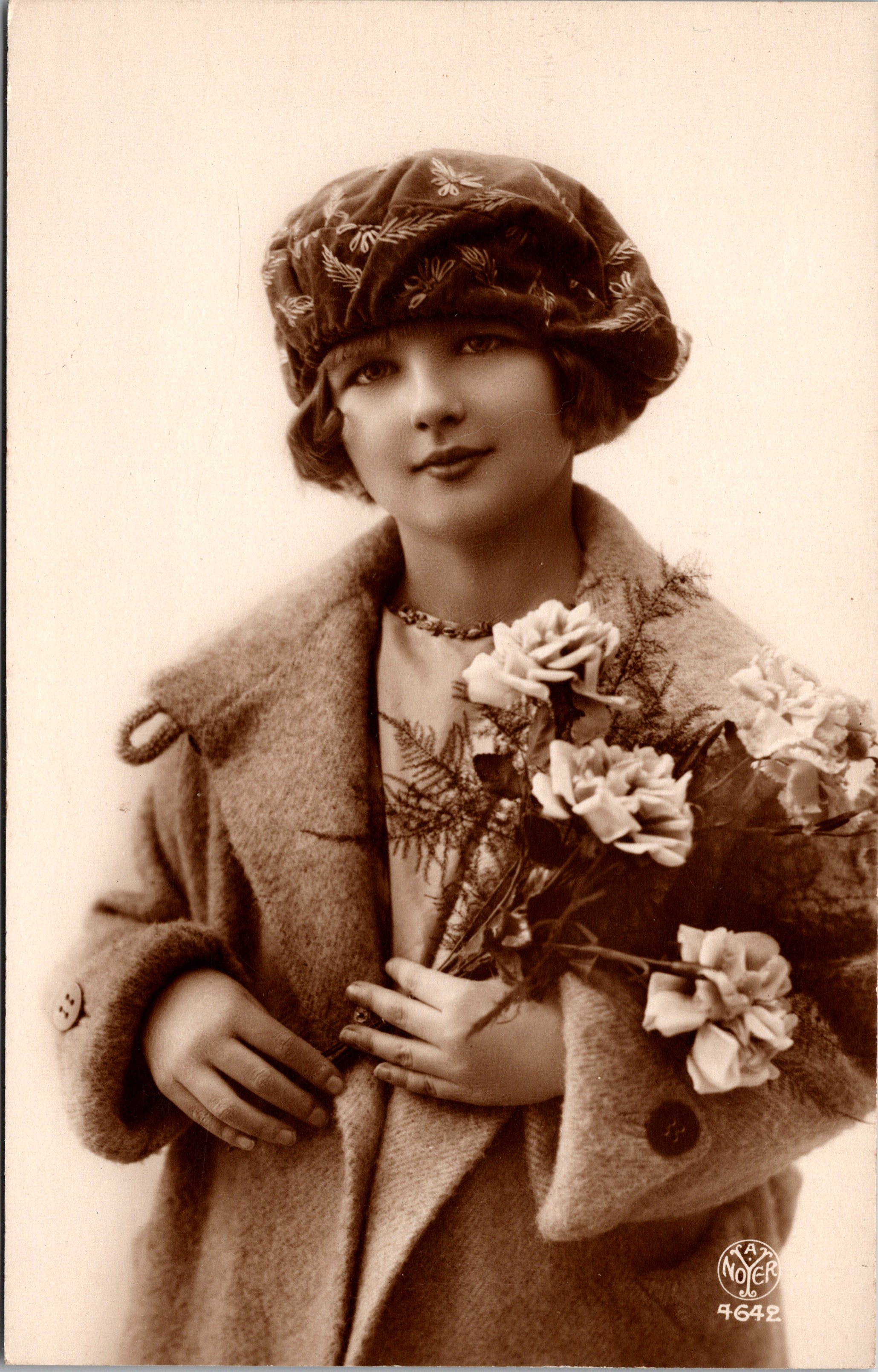 This vintage real photo postcard features a pretty girl holding a bouquet of flowers. She is wearing a lovely embroidered cap. The photographer and publisher of this portrait postcard was Alfred Noyer. He was a well known and acclaimed photographer. His Paris studio operated between 1910 and the 1940’s. This art deco postcard has excellent clarity and is in excellent condition (see scans).