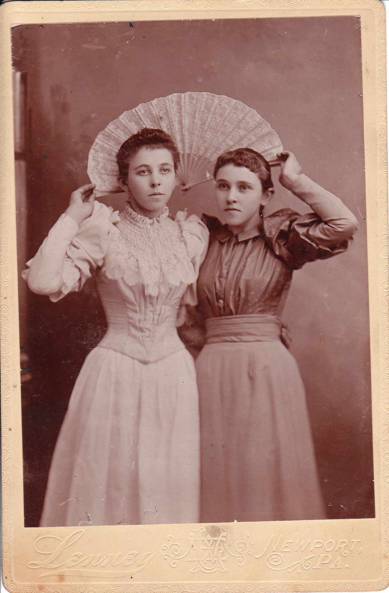 Two young women pose for their portrait in Newport, Pennsylvania. Both women are grasping one end of a fan that they hold behind their heads. Their raised arms highlight their hour glass figures which are given an assist by the corsets they are wearing. The photographer is named William Easter Lenney. He was located in Newport in the early 1890’s and moved to Atlanta, Georgia where he became a well known portrait photographer between 1894 and 1920. He and his family then moved to California. (SOLD)
