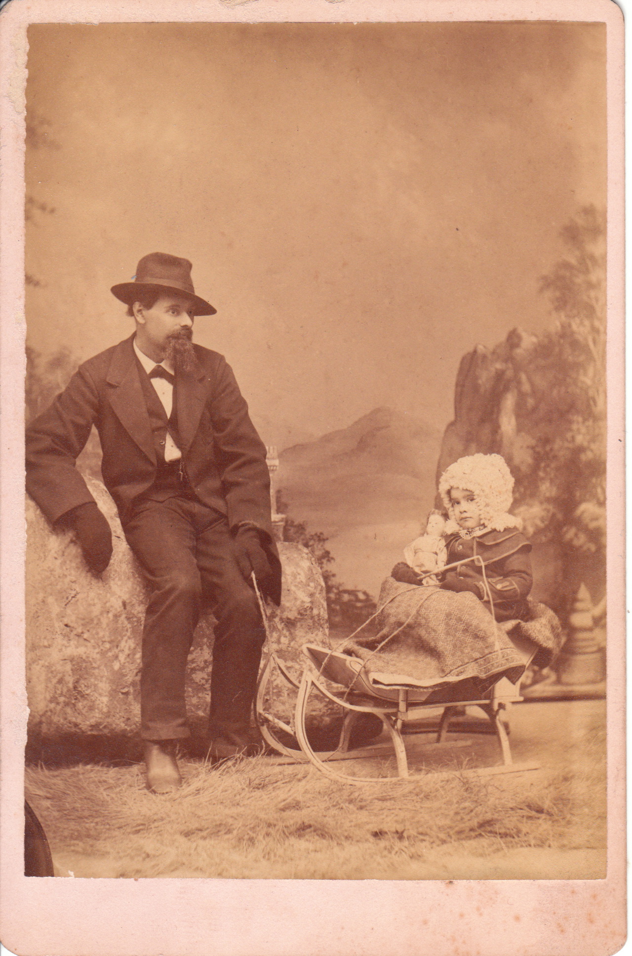 This studio portrait captures a slouching dad pulling his daughter on a sled. Dad is wearing a suit, hat, and gloves while the child is bundled up in a winter jacket and warm winter cap. She is holding the sleds steering rope. She won’t go far on the sled considering it is atop straw instead of snow. Dad has assumed a very awkward slouching position for this photograph. Perhaps he is disabled. It is also possible that the photographer did a poor job of posing the father. In fact, the photographer, S. P. Gaugler, shows little skill in his production of this photograph. The subject of this photograph is actually the owner of the Bellevue, Ohio studio that produced this image. According to the previous owner of this photograph, the album that this cabinet card was taken from indicated that the subject is Simon Peter Gaugler and the little girl is his oldest daughter, Edith. It is surprising that a photographer would do such a poor job of posing for this photograph. The 1880 US census lists Simon Gaugler (1840-1915) as residing in Bellevue, Washington and working as a photographer. He was forty years old and living with his 27 year-old wife Lorinda. The couple had married in 1874 and were raising a four year-old daughter (Edith) with the help of a live-in servant. The 1900 census found the couple still residing in Bellevue and living with their 15 year-old daughter (Ethel). Simon continued to work as a photographer. By the time 1910 arrived, Simon and Lorinda were living in Lyme, Ohio with their daughter Ethel and her husband John. Simon was still operating a photo gallery even though he was seventy years old. In 1914 Lorinda died in Bellevue and a year later, Simon passed away in Atlanta, Georgia. He had moved to Georgia to be with his daughter Edith, the adult version of the little girl pictured above. Edith Gaugler (1876-1960) had become Mrs. Frederick Schanck on 9/10/99. At the time of their marriage, she was a school teacher and her groom was a telegraph operator and clerk. Census data reveals that the couple lived in Lyme, Ohio (1900), and moved to Atlanta, Georgia sometime before 1920. The couple still lived in Atlanta at the time of the 1940 US census.