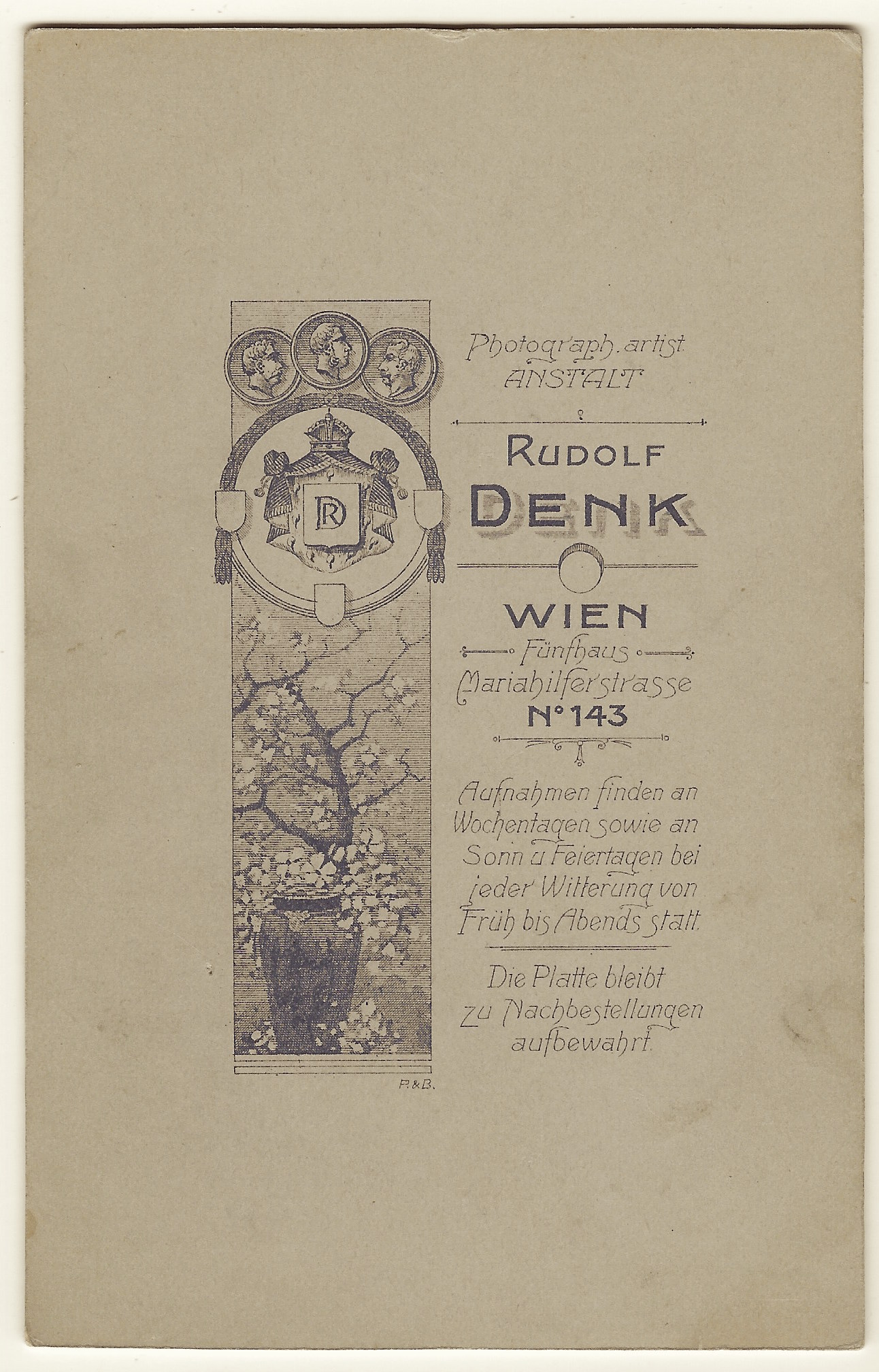 This cabinet card provides a portrait of a handsome uniformed Austro-Hungarian soldier. He is posing at the Rudolf Denk studio in Vienna, Austria. Note his high boots, sabre, and wrist watch. The soldier is wearing a couple of medals on his chest. His cap is on the table beside him. He is wearing a whistle which can be seen between his two breast pockets. The soldier is holding an open book. It is likely that this young man saw military action. World War I was not many years away from the time that he sat for this photograph.