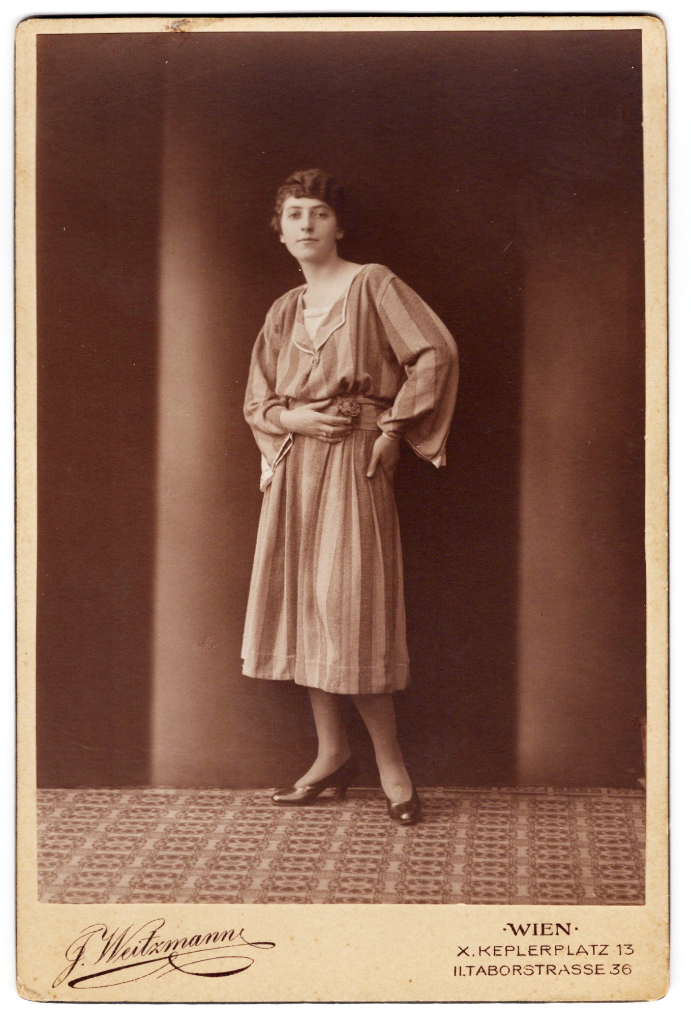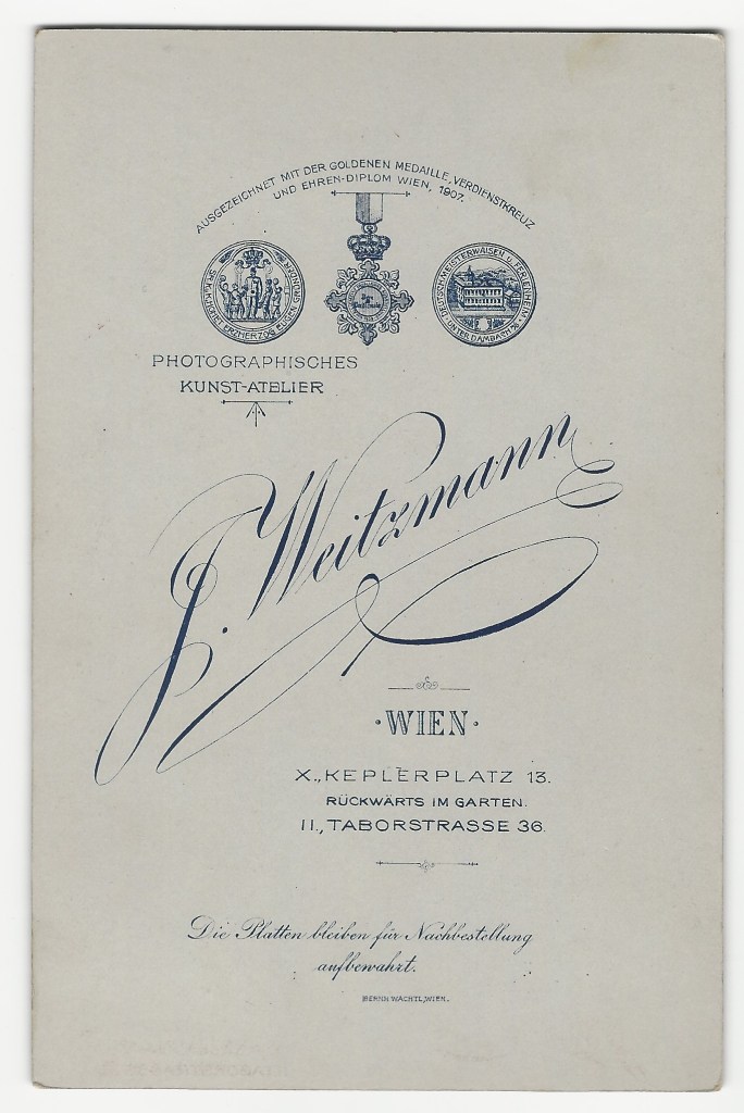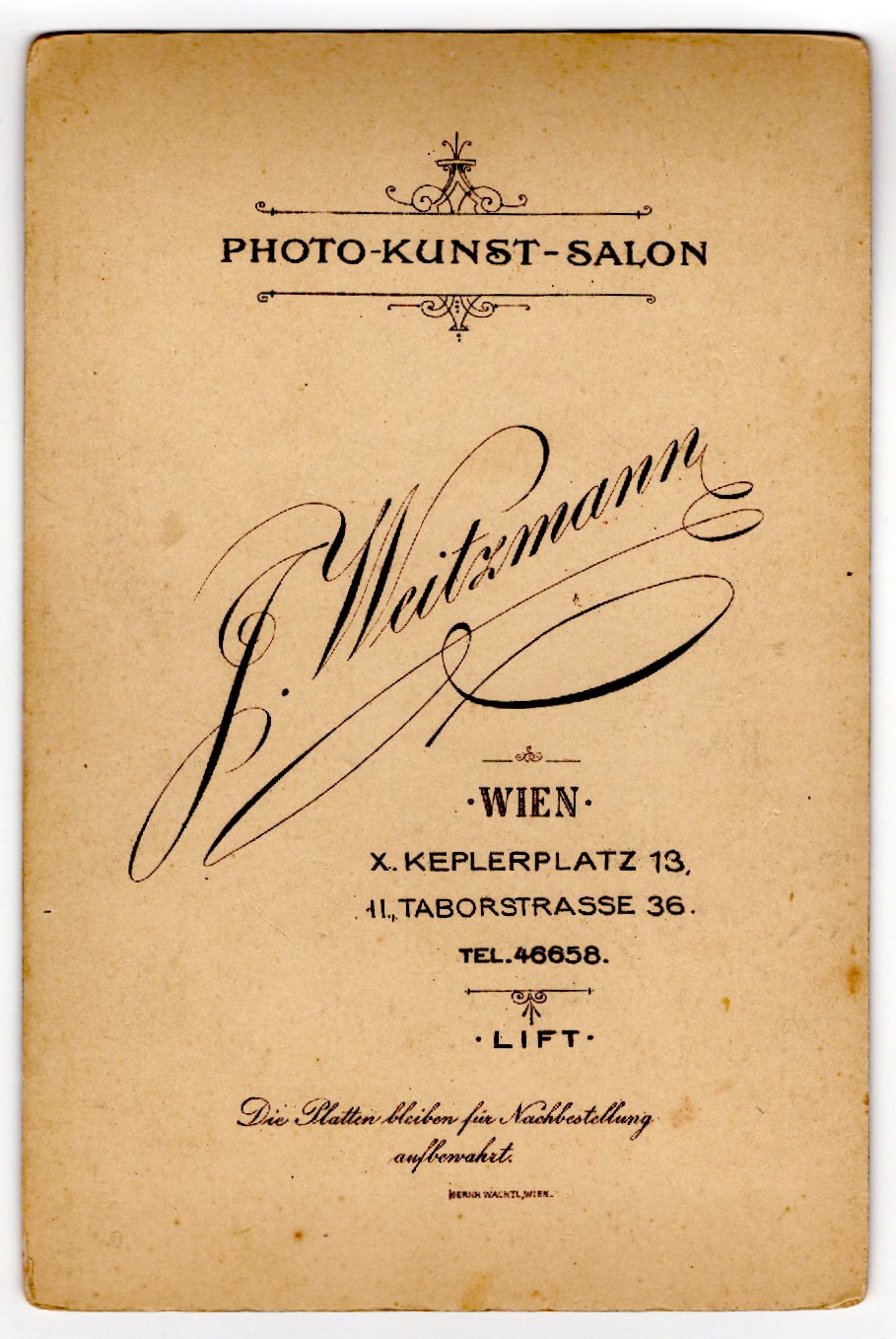 This cabinet card portrait of a fashionable and attractive young woman is by photographer S. Weitzmann of Vienna, Austria. The image is quite stark because no props are used in the photograph. However, the lighting in the photograph creates an interesting striped effect on the wall behind the subject. The subject is unidentified. She is wearing a loose fitting dress that has a pin on it’s neckline and she is wearing a bracelet and ring. The reverse of the photograph has printing which repeats the address of the photographers studio and also lists a phone number. Research did not reveal when phone service was introduced to Vienna but did discover that international phone service between Vienna and Berlin was introduced in 1894. The date of this photograph remains unknown. To learn about S. Weitzmann and to view more of his photographs, click on the category “Photographer: Weitzmann”. This cabinet card photograph is in very good condition (see scans).