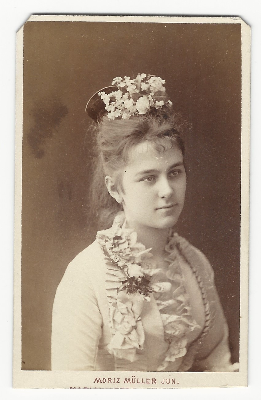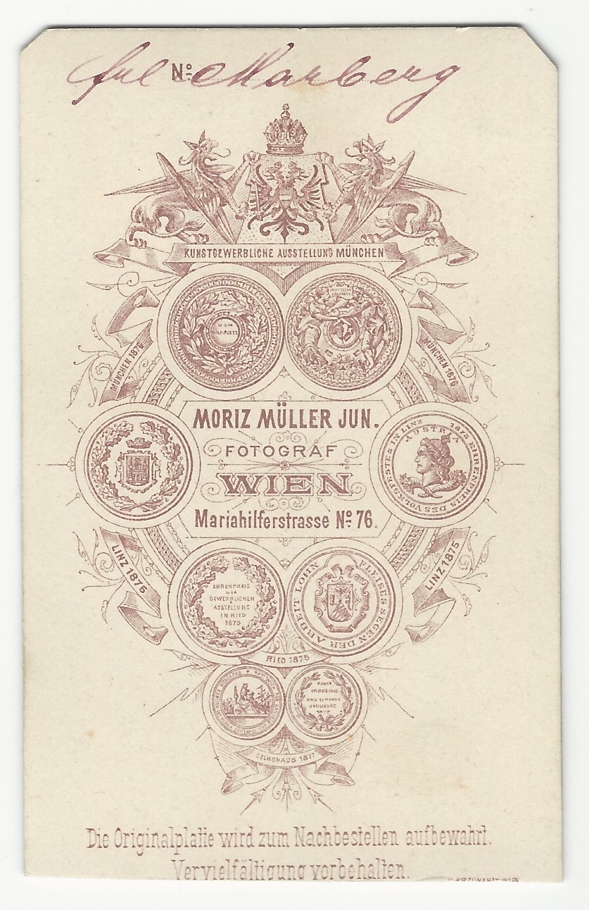 This carte de visite portrait features actress Julie Marberg. She appears quite young in this photograph. She is wearing flowers in her hair and it appears that she is also wearing a hat or bow. Cdv photographs of Miss Marberg can be found in the collections of the Vienna Museum, as well as the Vienna Theater Museum. This photograph was taken by Moriz Muller Jr.. He operated a photo studio in Vienna, Austria. The reverse of the photograph displays a number of European photography awards the studio won in the 1870’s. This photograph has been trimmed to fit into an album or frame. SOLD