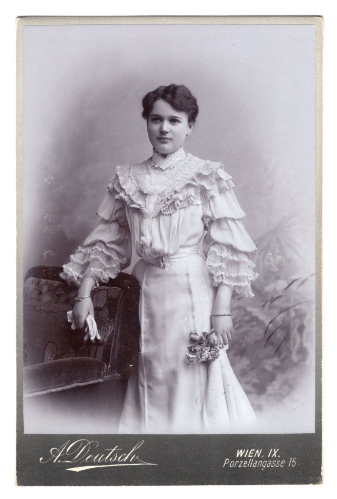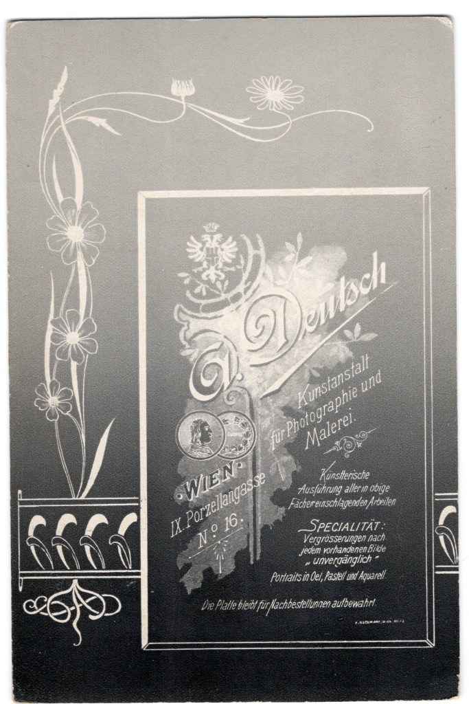 A pretty young lady poses for her portrait at the studio of A. Deutsch in Vienna, Austria. The woman is beautifully dressed. Perhaps she is wearing a wedding gown. Her fancy dress indicates that she probably comes from an affluent family. She is holding a bouquet of flowers in one hand and white gloves in the other hand. She is wearing a bracelet on each wrist. She appears to be in her teenage years or slightly older. The reverse of this cabinet card has pretty and unusual advertising for the Deutsch studio. This portrait cabinet card has excellent clarity and is in very good condition (see scans).