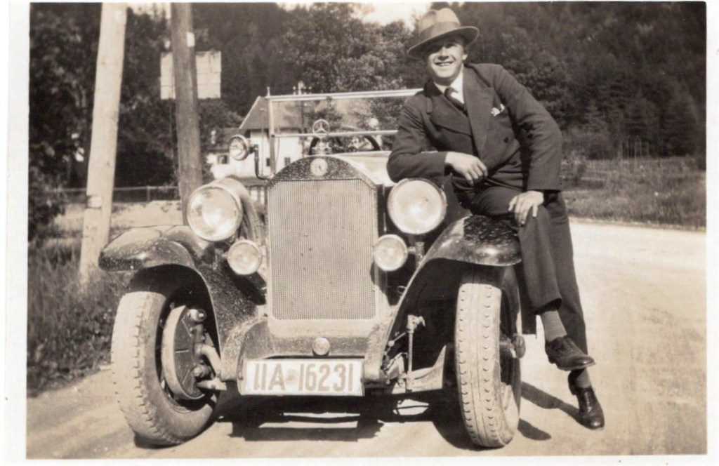 This snapshot photograph features an outstanding view of an antique Mercedes and it’s sell dressed owner. He has a nice smile for the camera, and who can blame him? He owns a beautiful automobile. Note the European (German) license plate and the Mercedes hood ornament. (SOLD)