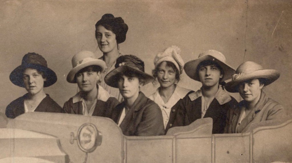 This vintage real photo postcard features seven young women who appear to be having fun as they pose for their portrait as they sit in a faux automobile at an unidentified photo studio. These women are likely a group of friends. They are very fashionable and glamourous. It is curious that six of the seven women are wearing hats while the seventh appears to either be a non conformist, or left hers at home. Take note of the only woman that is wearing a white outfit. She has a wonderful playful “cat ate the canary” expression. A close-up photo of the vivacious young lady has been provided. SOLD