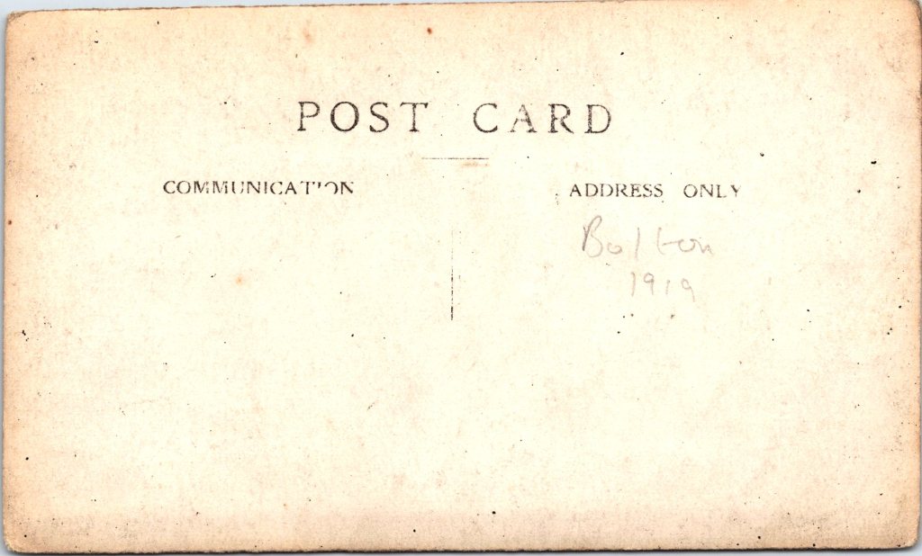 This vintage real photo postcard features two young men out for a drive in a Renault convertible. Note the emblem above the front grill of the car, and also the folded down front windshield. The stretch of road that the two rode down is quite beautiful. It is a dirt road with a canopy of leaves from two columns of trees lining the way. The reverse of this postcard reveals that the postcard formerly resided in a postcard album. Writing on the back of the card indicates that it was written in 1919. The Artura stamp box dates the card somewhere between 1908 and 1924. This vintage postcard is good illustration of Automobile History. (SOLD)