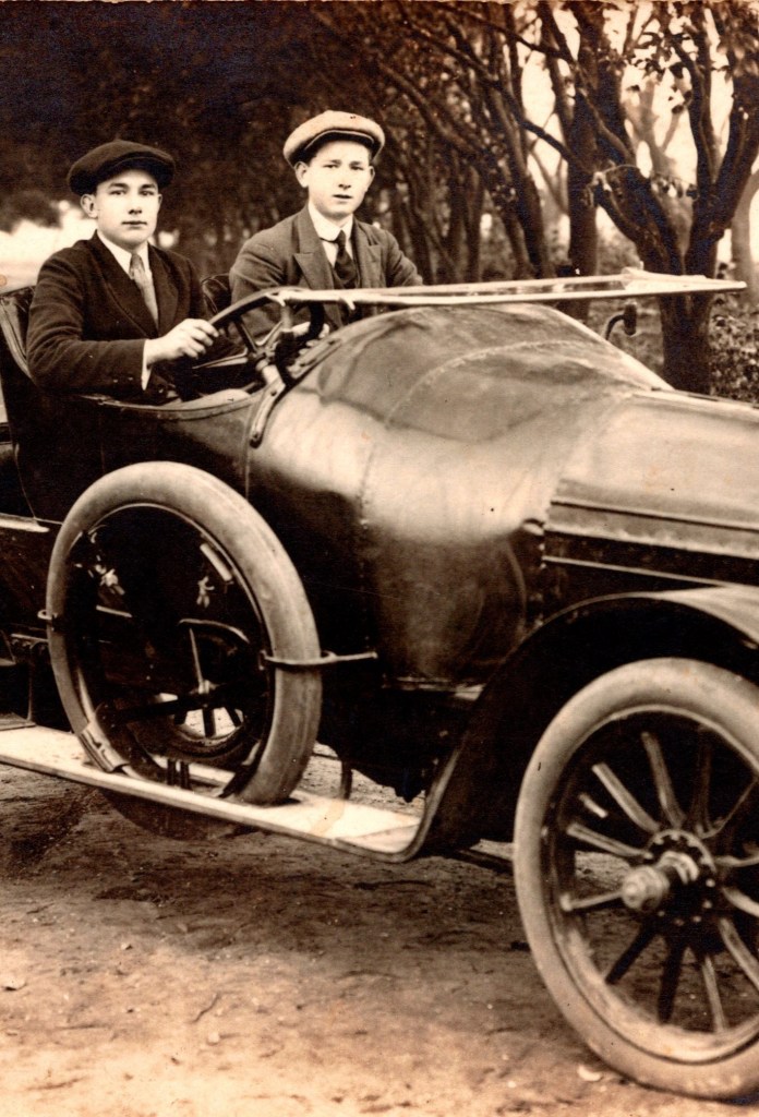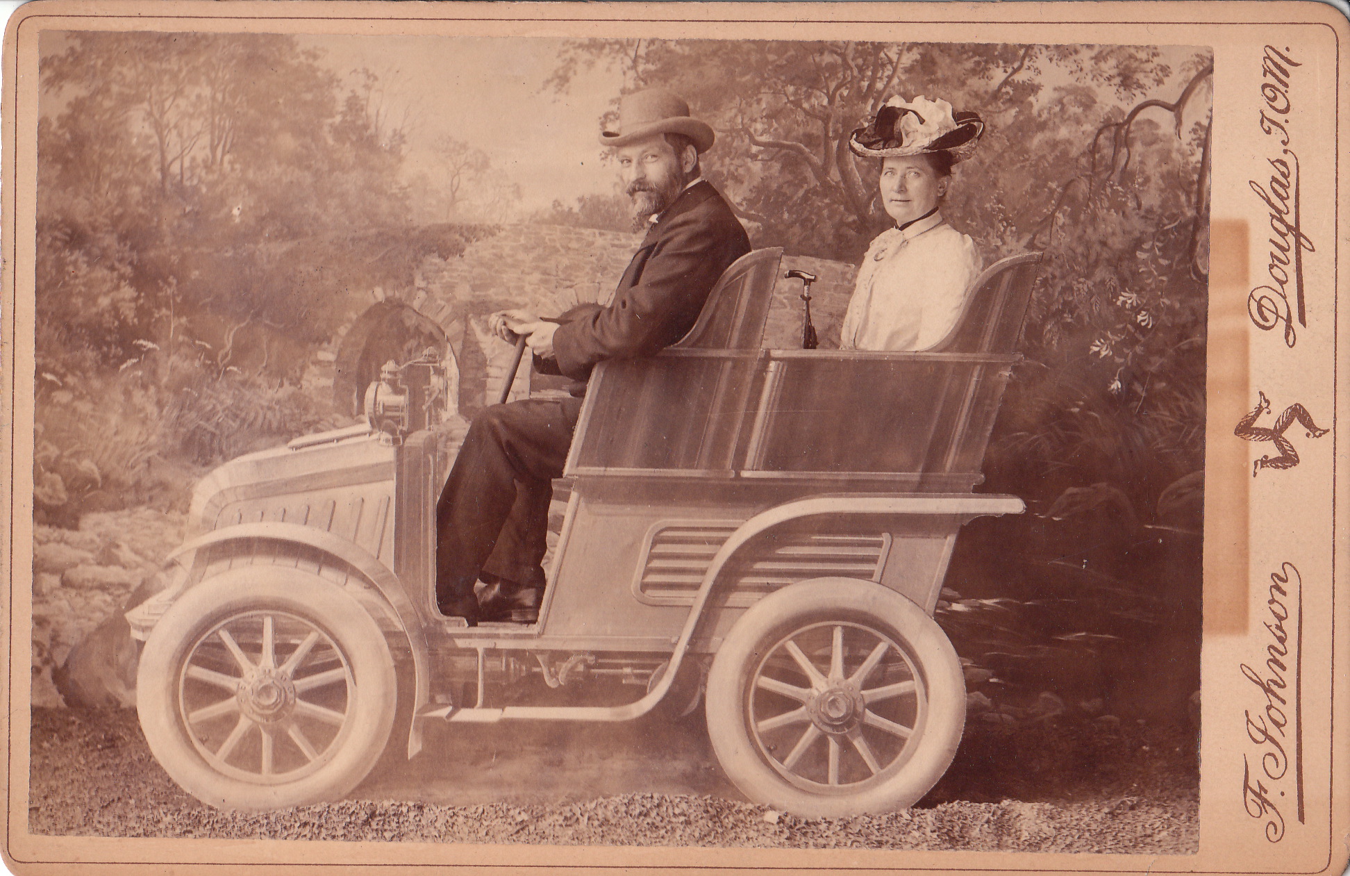 A man and a woman, presumably, a married couple, pose for their portrait in a car that is going nowhere. This automobile is simply a photographer’s prop. The advantage of a married couple being in a car that is going nowhere, is that the man can’t get lost, and then deny it; and the woman can’t keep telling him to stop and ask for directions. The pictured car is located in the photographic studio of Frederick Johnson. Johnson’s studio was in the town of Douglas, on the Isle of Man. He actually operated two studios there; the Fort William Studio, and the Express Bridge and Battery Studio. The Isle of Man is a self-governing British Crown Dependency located in the Irish Sea, between Great Britain and Ireland. At the time of this photograph, the Isle of Man was a major tourist attraction, and according to many accounts, tourists flocked to photographers during their vacations there. Not much information could be found about the photographer of this image. It is known however, that he operated a studio on the Isle of Man during 1881 through 1894. He may have also been there before, or after, the aforementioned years. As an aside, it is interesting to note that during the early days of automobiles in America, some photography studios were built that were designed to allow patrons to drive their cars into the studio, and pose alone, or with their passengers, for portraits of them sitting in their cars. This practice was truly a reflection of the history of Americans love affair with their automobiles.