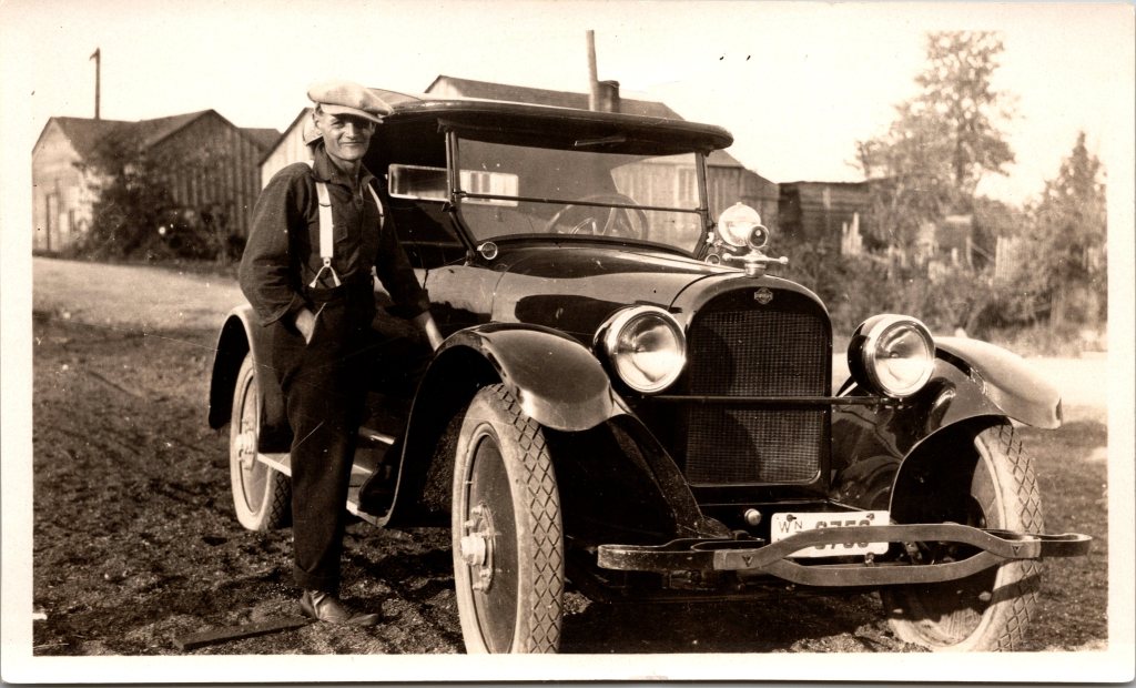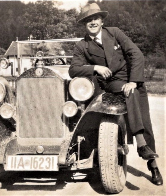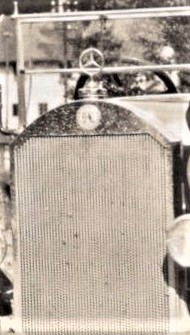 This snapshot photograph features an outstanding view of an antique Mercedes and it’s sell dressed owner. He has a nice smile for the camera, and who can blame him? He owns a beautiful automobile. Note the European (German) license plate and the Mercedes hood ornament. (SOLD)