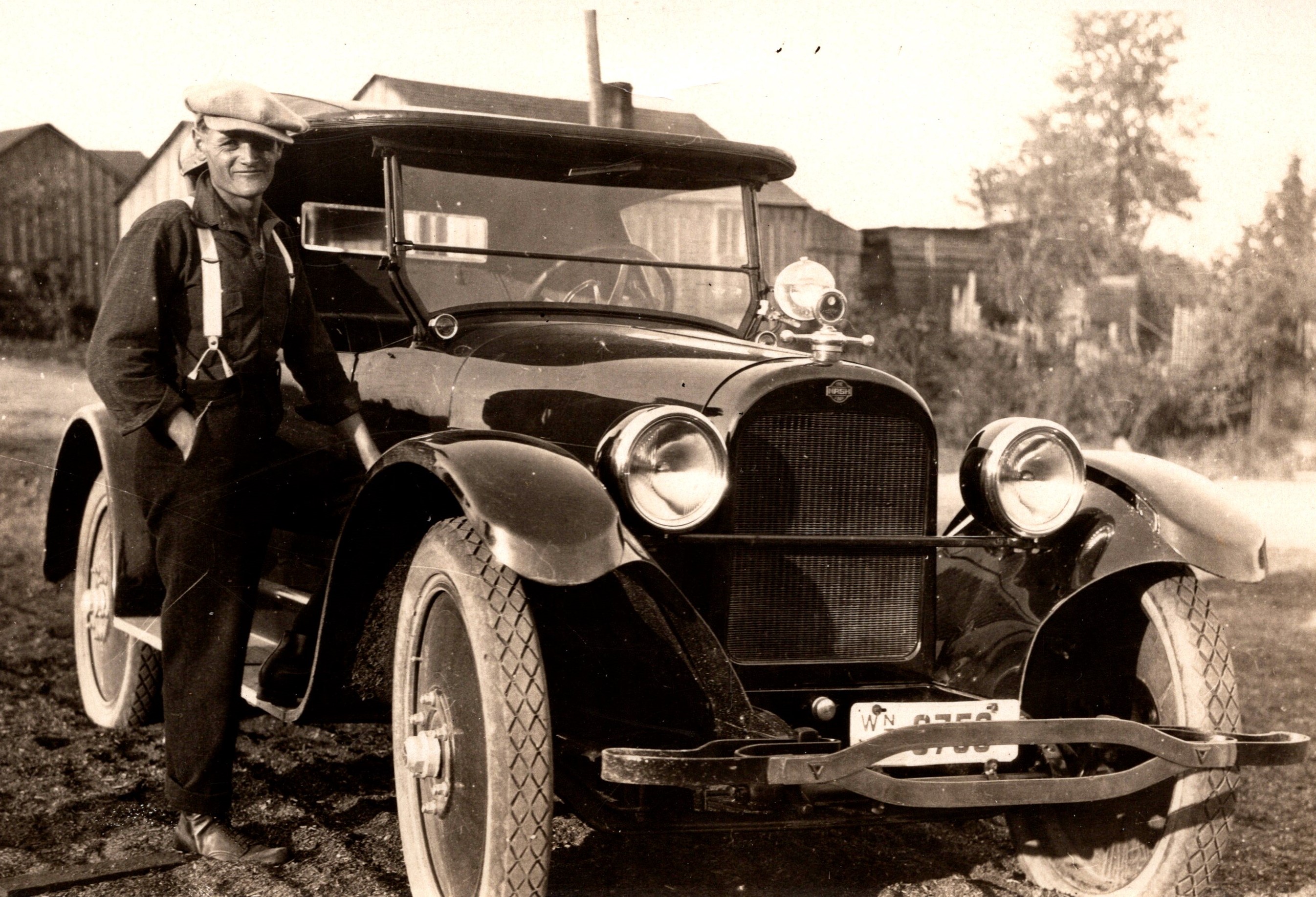 This vintage snapshot photograph features a proud driver standing next to his beautiful automobile. I believe the car is a Nash Roadster from the 1930’s. The Nash nameplate can be seen on the grill of the automobile. Note the car’s thin tires and bug-eye headlights. This vintage snapshot photograph measures 5.5″ x 3.25″. SOLD