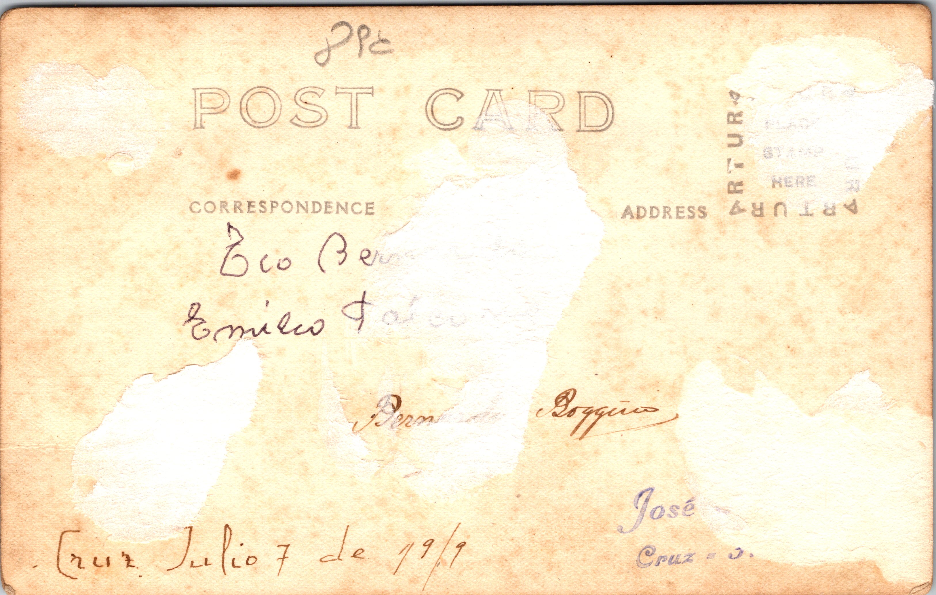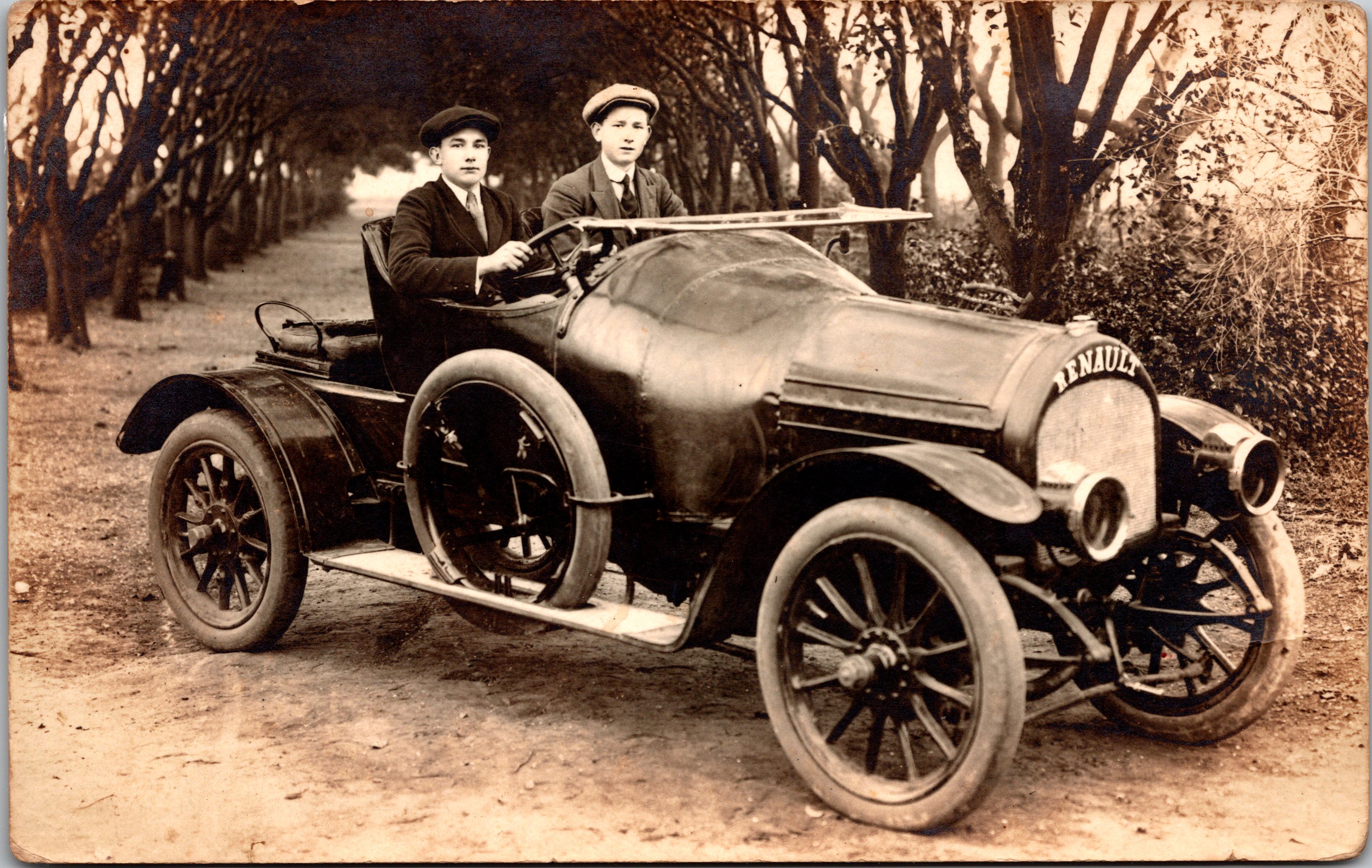 This vintage real photo postcard features two young men out for a drive in a Renault convertible. Note the emblem above the front grill of the car, and also the folded down front windshield. The stretch of road that the two rode down is quite beautiful. It is a dirt road with a canopy of leaves from two columns of trees lining the way. The reverse of this postcard reveals that the postcard formerly resided in a postcard album. Writing on the back of the card indicates that it was written in 1919. The Artura stamp box dates the card somewhere between 1908 and 1924. This vintage postcard is good illustration of Automobile History. (SOLD)