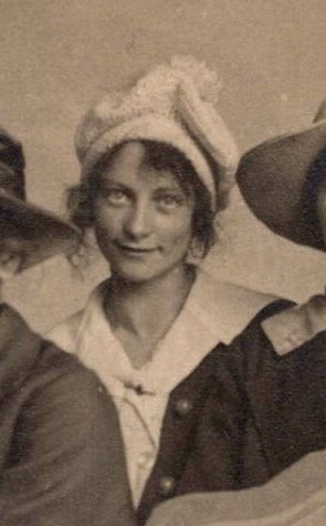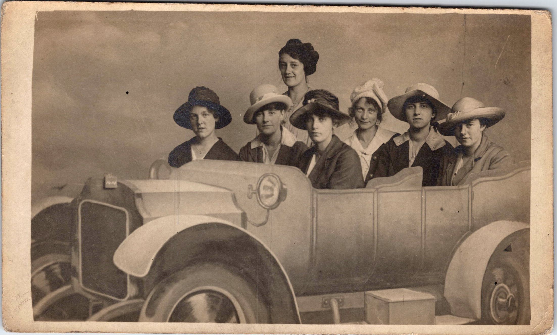 This vintage real photo postcard features seven young women who appear to be having fun as they pose for their portrait as they sit in a faux automobile at an unidentified photo studio. These women are likely a group of friends. They are very fashionable and glamourous. It is curious that six of the seven women are wearing hats while the seventh appears to either be a non conformist, or left hers at home. Take note of the only woman that is wearing a white outfit. She has a wonderful playful “cat ate the canary” expression. A close-up photo of the vivacious young lady has been provided. SOLD