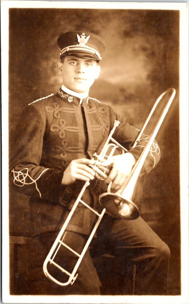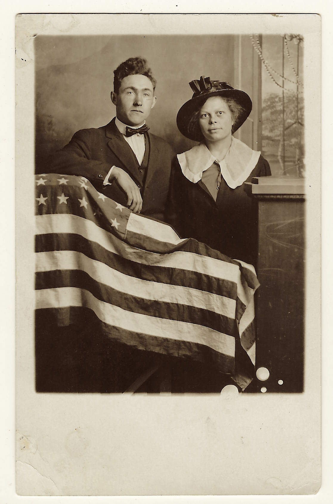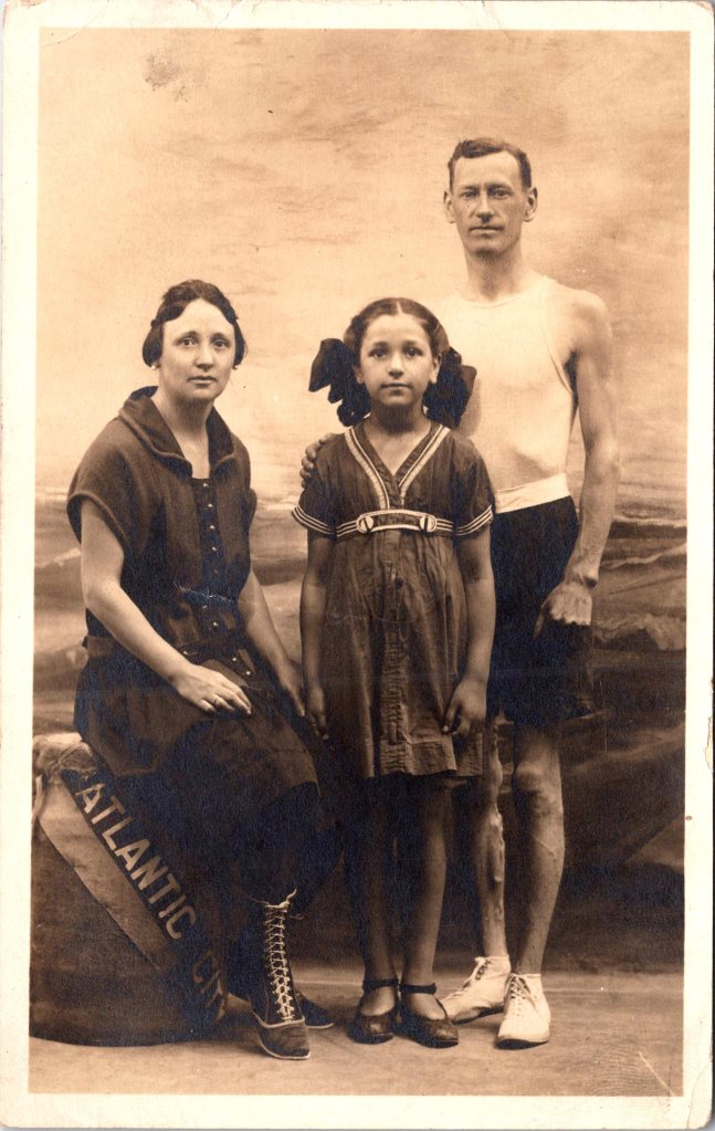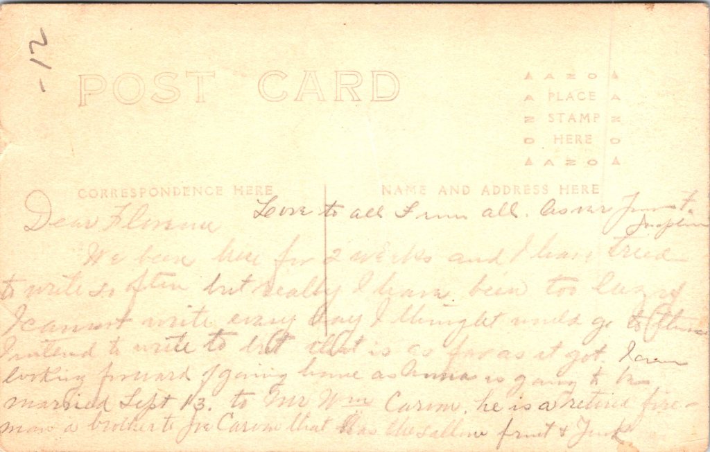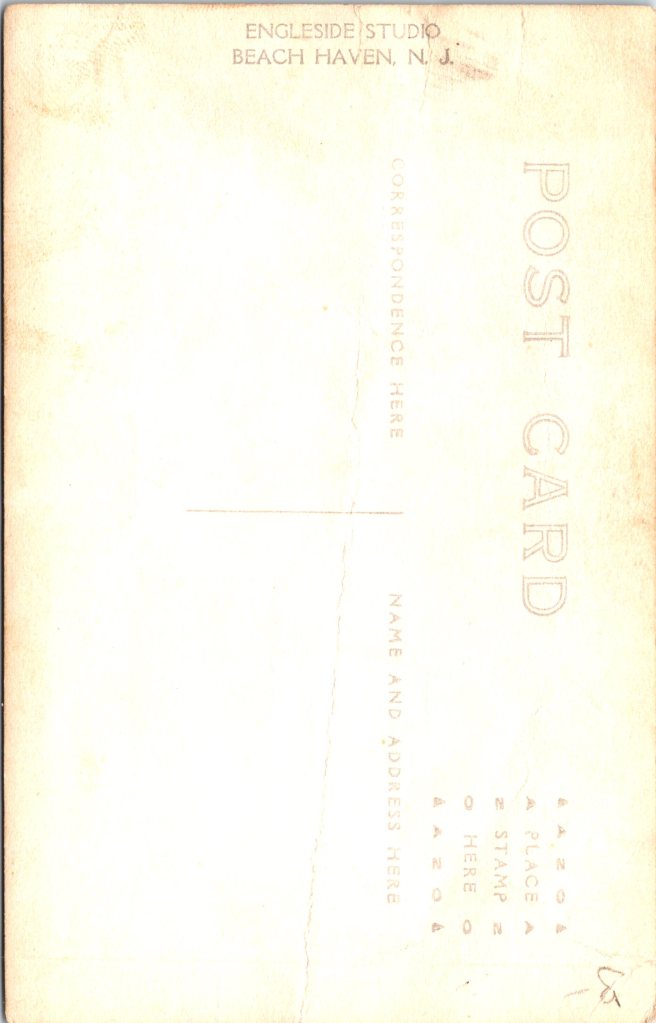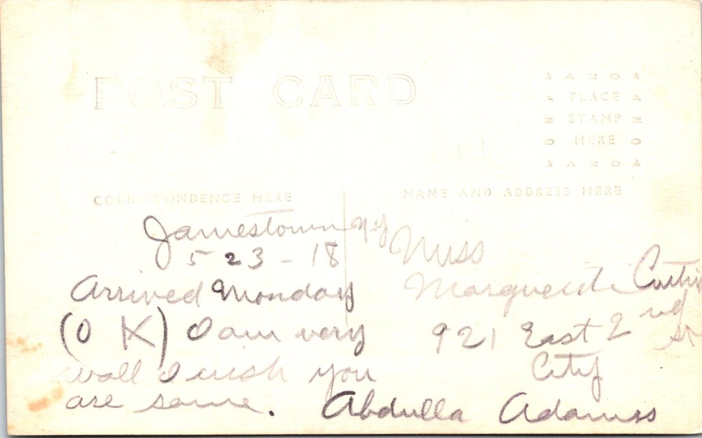 This is a vintage real photo postcard (RPPC) portrait of a young African American woman standing in front of a porch in front of a house. She holds a vase of flowers in one hand, and with the other she lightly rests on a wooden chair beside her, on which her hat lies. Along the porch railing (behind her) are potted plants that add a charming domestic detail to the setting. She’s dressed in a light-colored, modest dress with three-quarter sleeves. Around her neck is a pendant necklace suspended from a fine chain. The pendant appears to be a small oval or medallion (hard to see the exact motif, but visible in closeups). Her hair is styled simply (likely bobbed or softly waved), and her expression is calm, with a slight, poised gaze toward the camera. The photo was taken outdoors (natural light) in front of a porch, likely in a residential neighborhood. The background includes lattice or railings, and potted plants suggest someone cared for the space. The chair beside her provides a prop that complements the composition. On the reverse, the card bears an AZO stamp box, with two triangles at the top pointing upward and two triangles at the bottom pointing downward. That is a known style used in ASO / AZO postcard backs, and those two-up/two-down triangles typically date a postcard to the ~1918 to 1930 period. Also, the reverse has the handwritten name and address. The name is Hattie Gilmore and the address is in Los Angeles. Presumably, the woman in the photo is Hattie. (SOLD)
