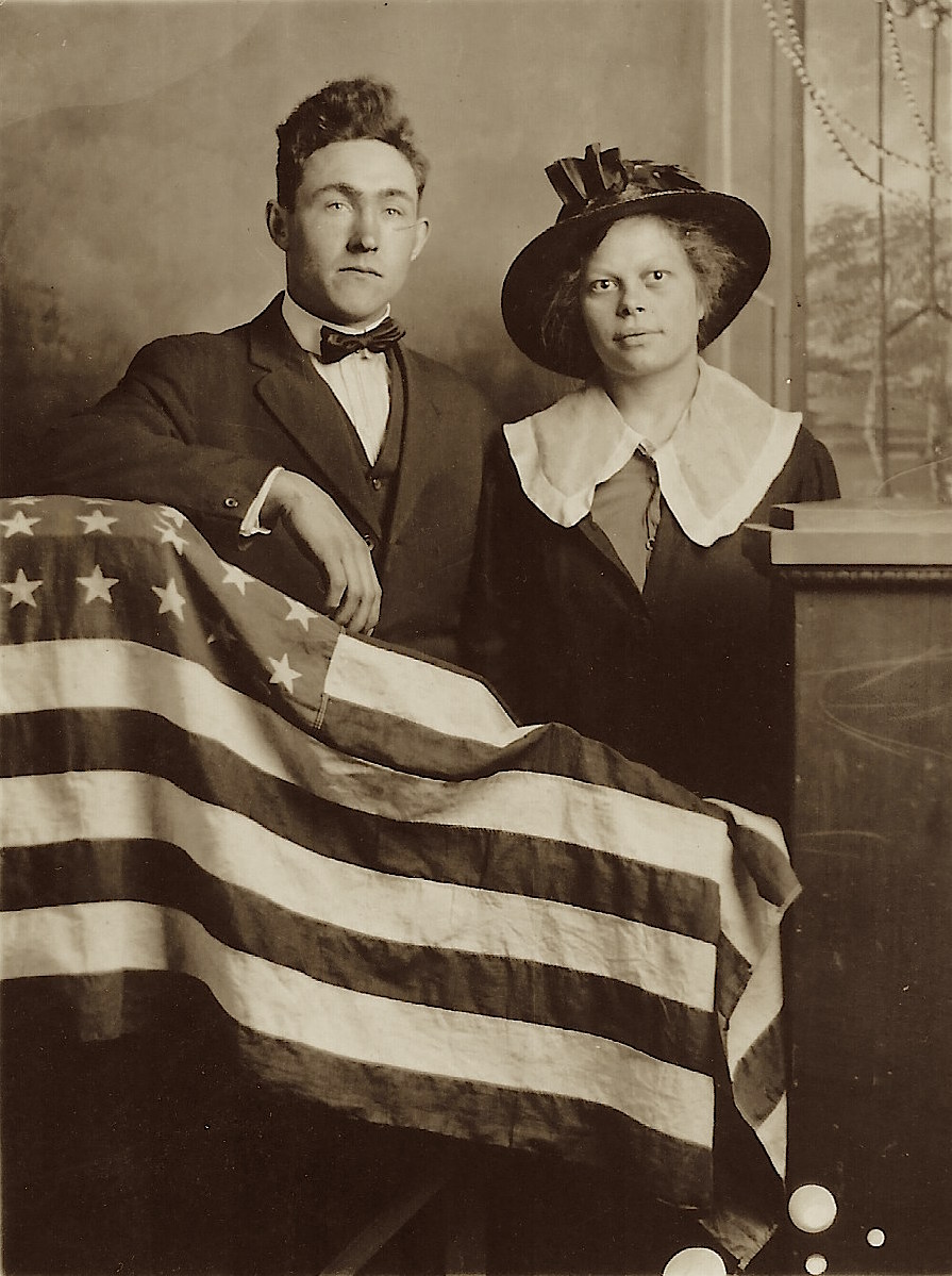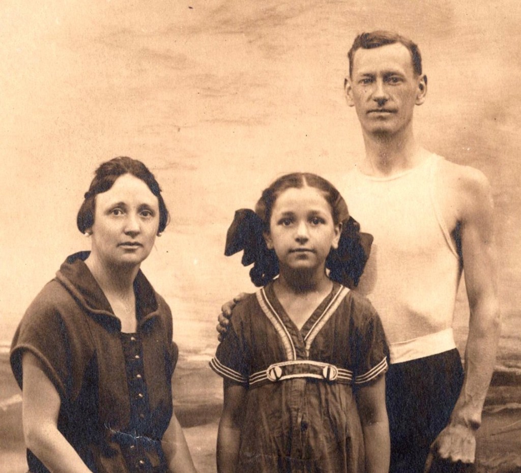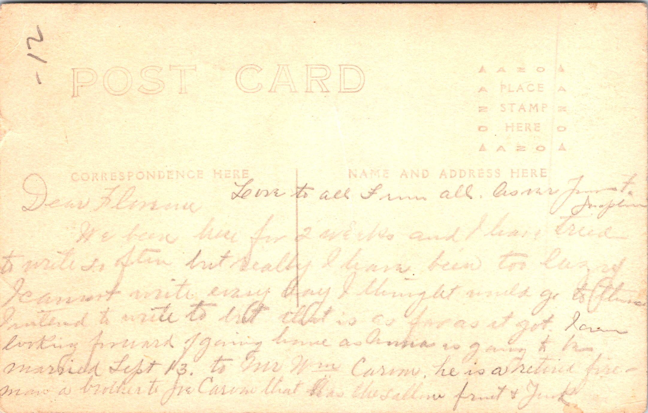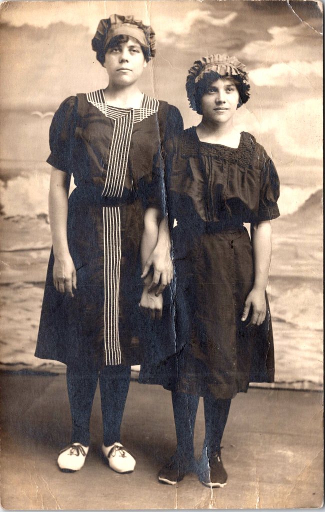This is a vintage real photo postcard (RPPC) portrait of a young African American woman standing in front of a porch in front of a house. She holds a vase of flowers in one hand, and with the other she lightly rests on a wooden chair beside her, on which her hat lies. Along the porch railing (behind her) are potted plants that add a charming domestic detail to the setting. She’s dressed in a light-colored, modest dress with three-quarter sleeves. Around her neck is a pendant necklace suspended from a fine chain. The pendant appears to be a small oval or medallion (hard to see the exact motif, but visible in closeups). Her hair is styled simply (likely bobbed or softly waved), and her expression is calm, with a slight, poised gaze toward the camera. The photo was taken outdoors (natural light) in front of a porch, likely in a residential neighborhood. The background includes lattice or railings, and potted plants suggest someone cared for the space. The chair beside her provides a prop that complements the composition. On the reverse, the card bears an AZO stamp box, with two triangles at the top pointing upward and two triangles at the bottom pointing downward. That is a known style used in ASO / AZO postcard backs, and those two-up/two-down triangles typically date a postcard to the ~1918 to 1930 period. Also, the reverse has the handwritten name and address. The name is Hattie Gilmore and the address is in Los Angeles. Presumably, the woman in the photo is Hattie. (SOLD)