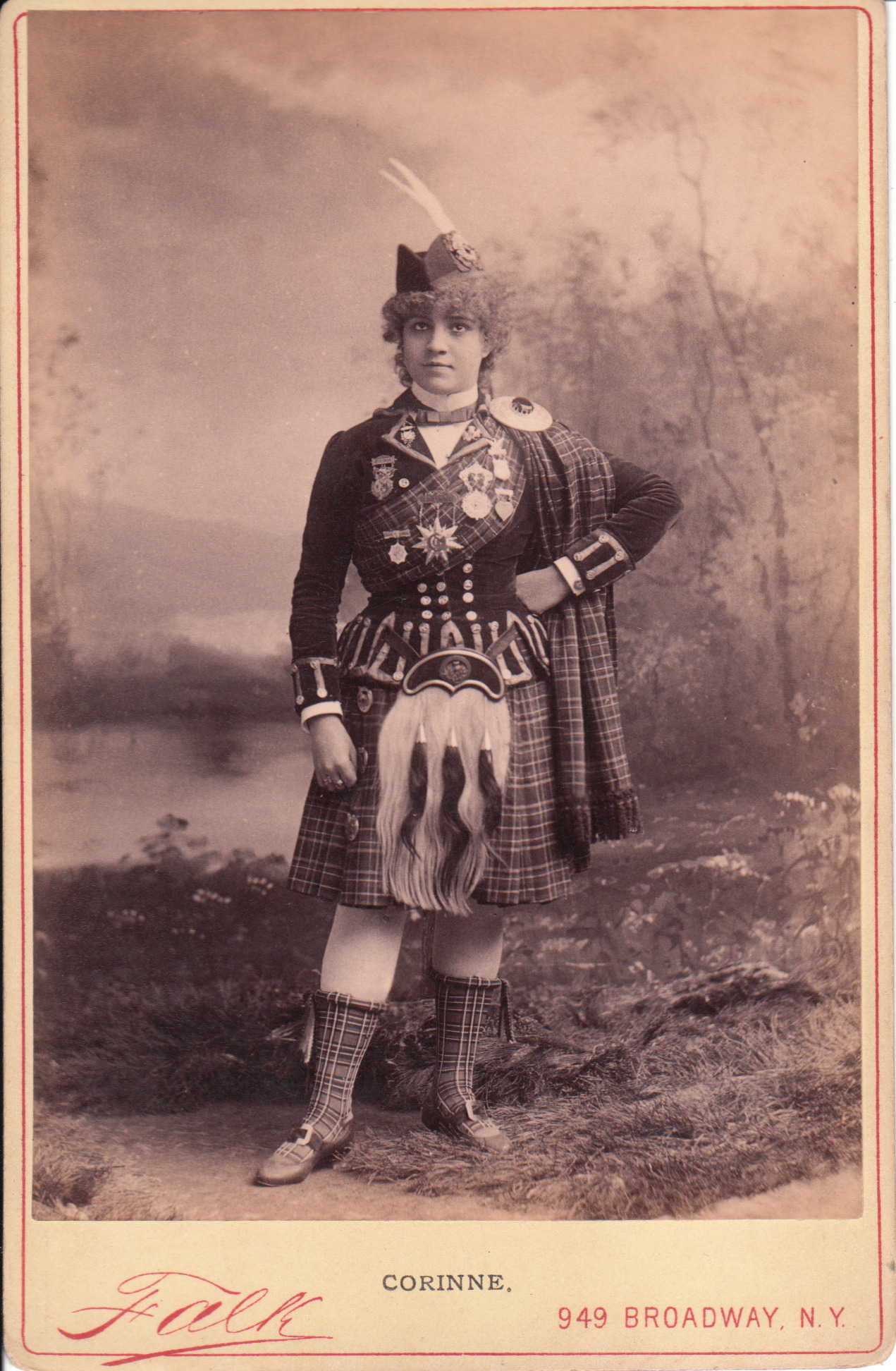 Cabinet Card 2 pictures Miss Corinne and was published by Newsboy (#20 of a series). She is wearing jewelry galore and flowers in her hair. What is that contraption that she is wearing around her waist? Is it a pouch? If so, what is it meant to carry? SOLD