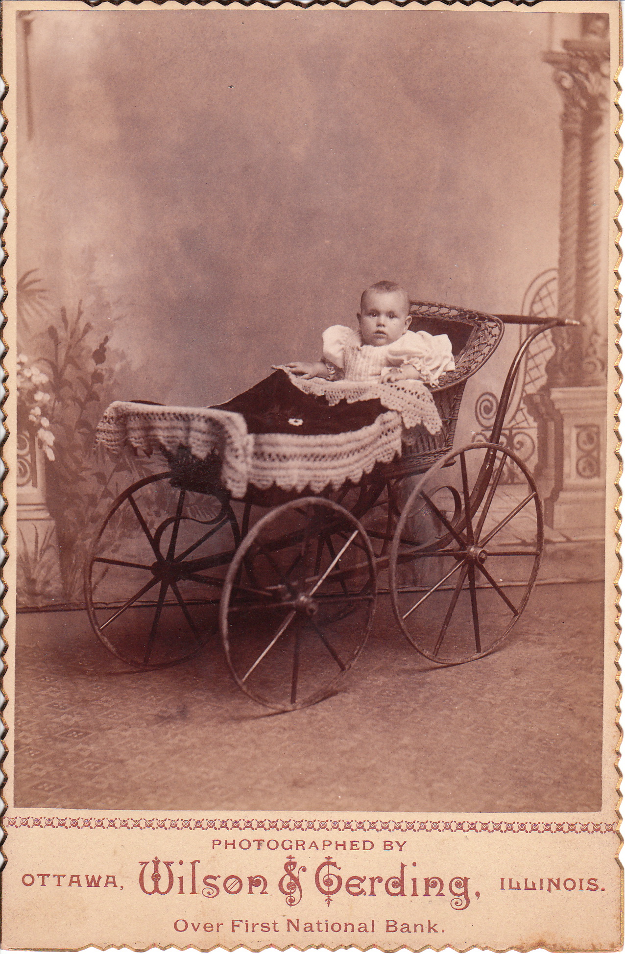 This scalloped edged cabinet card captures a baby sitting in a carriage in the studio of J. A. Wilson & August F. Gerding, in Ottawa, Illinois. The attentive baby seems to be intensely surveying the studio. A blanket sits neatly atop the carriage. To see a collection of baby carriage cabinet cards, click on the Cabinet Card Gallery’s category “Baby Carriage”.