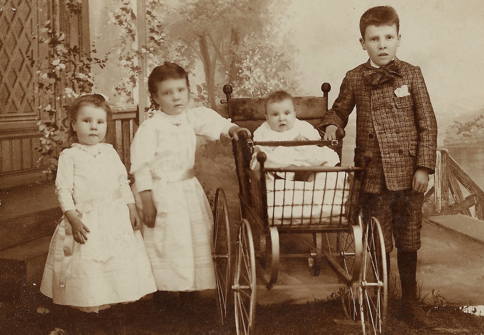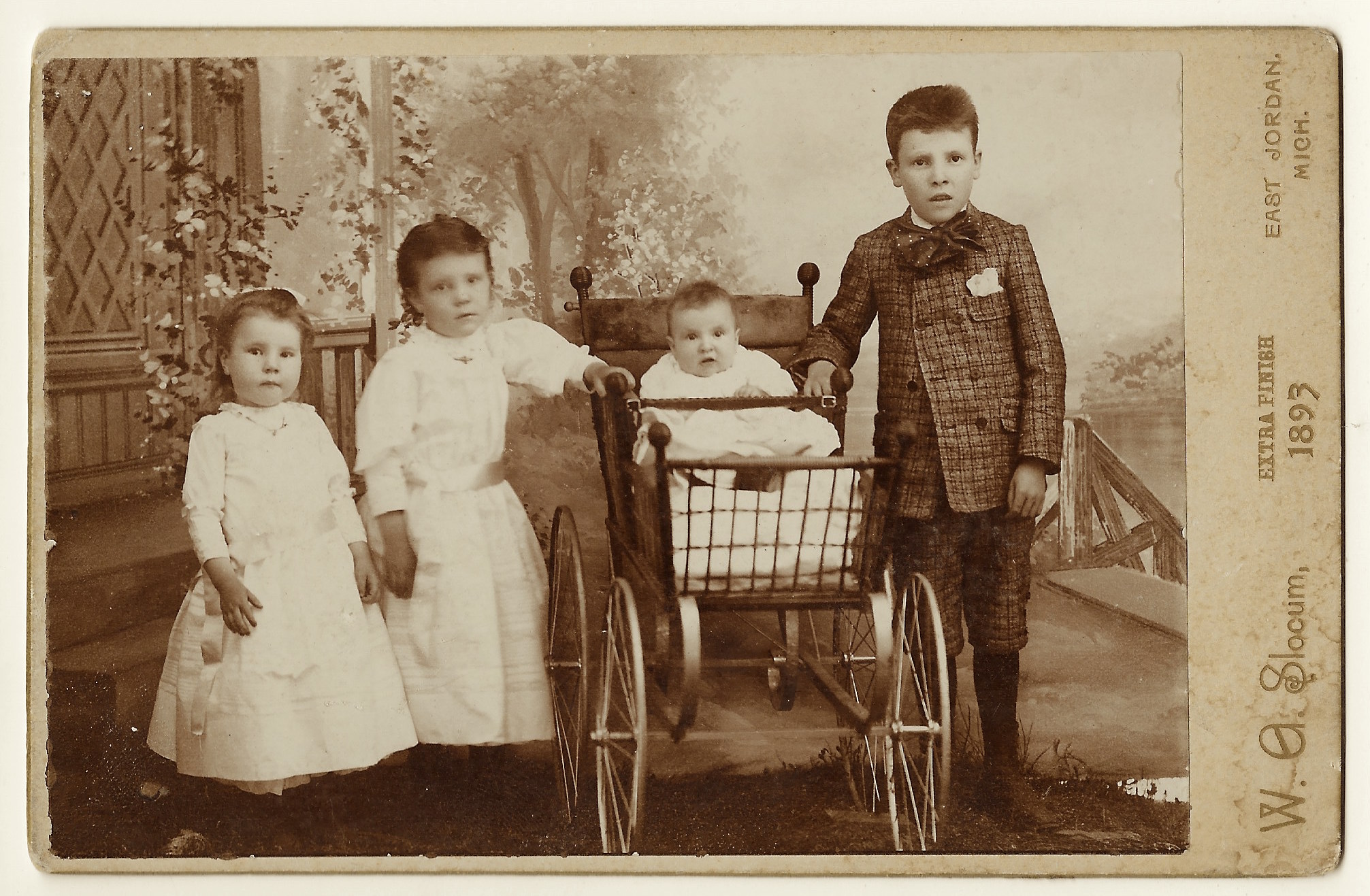 PORTRAIT OF FOUR YOUNG SIBLINGS IN EAST JORDAN, MICHIGAN (1893 BABY CARRIAGE)
