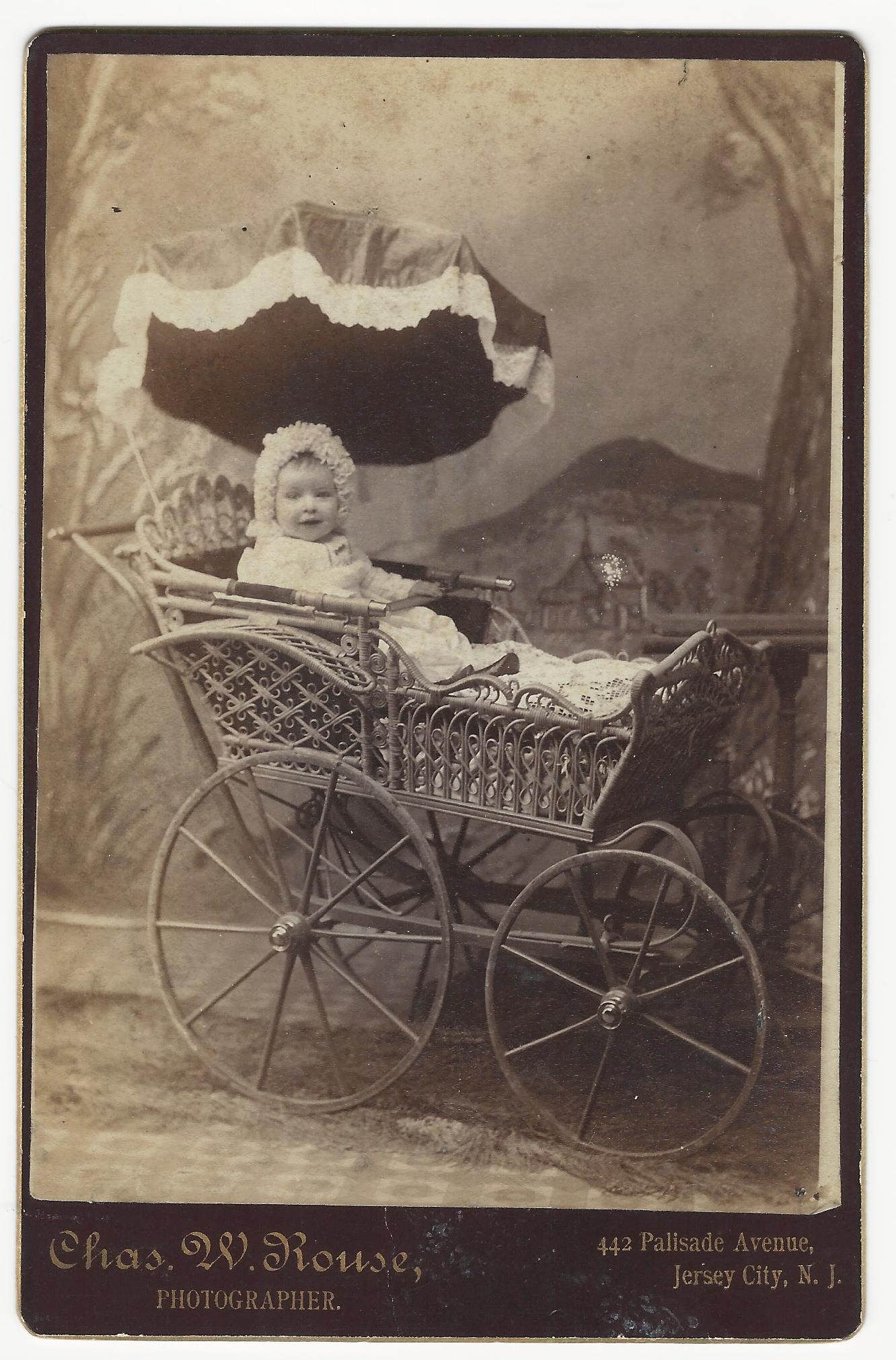 This cabinet card portrait features a baby sitting in a baby carriage. The carriage is a deluxe baby transporter. The vehicle looks well built and sits high off the ground. The carriage is accessorized with a large umbrella to protect the child from the sun or rain. The photographer of this image is Charles W. Rouse. He operated a photography studio in Jersey City, New Jersey. A list of early New Jersey photographers reveal that Charles Rouse operated out of at least six addresses in Jersey City during his career. In addition, at one point he ran a studio in Belmar, New Jersey. He conducted business at the address listed on this photograph (442 Palisade Avenue) between 1888 and 1894. (SOLD)
