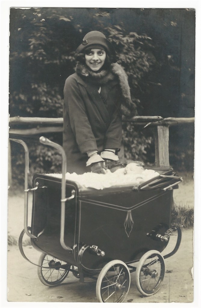 This vintage real photo postcard features a pretty mother posing with her infant child lying comfortably in a vintage perambulator (baby carriage). The carriage is large and looks very secure. Imagine a parent trying to fit one of these “monsters” into the back of their automobile. I think it’s a safe bet that this perambulator did not fold smaller for easy transport. Mom looks very proud and very happy as she stands behind her baby. She is bundled up for winter weather. Note her leather gloves and fur scarf. The baby appears to be bundled up warmly for the venture outdoors. The child has a “nook” in his/her mouth. This photo is from a studio; it is not mass produced. This photo postcard is in very good condition (see scans).