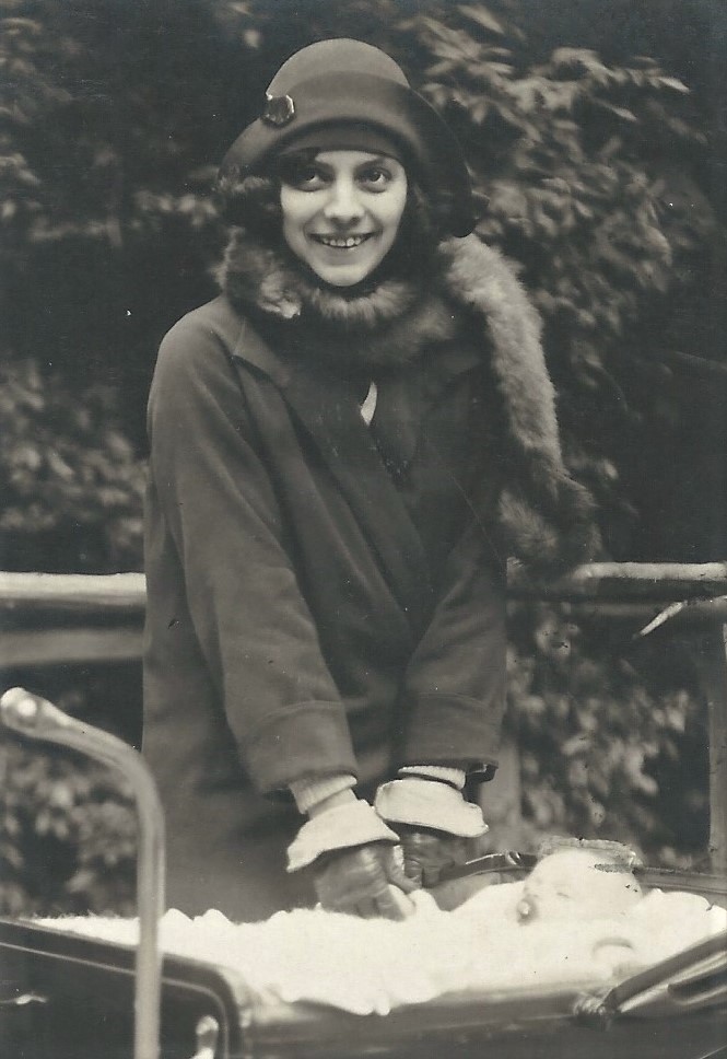 A PROUD MOTHER POSES WITH HER INFANT NESTLED SNUGLY IN A PERAMBULATOR