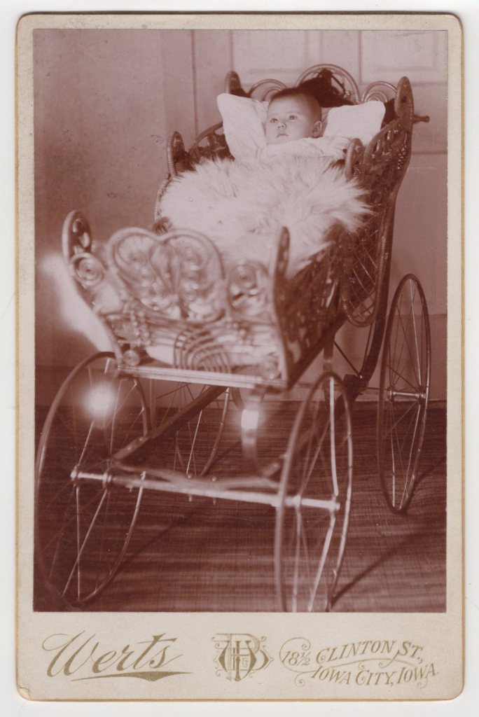 This cabinet card features a baby in an ornate baby carriage. The child is covered by a fur blanket and has a comfortable looking pillow. The photographer is P. D. Werts of Iowa City, Iowa. Werts is mentioned in two photography journals from 1894. One of the journals includes one of his photographs of Iowa’s Governor and the Governor’s wife.