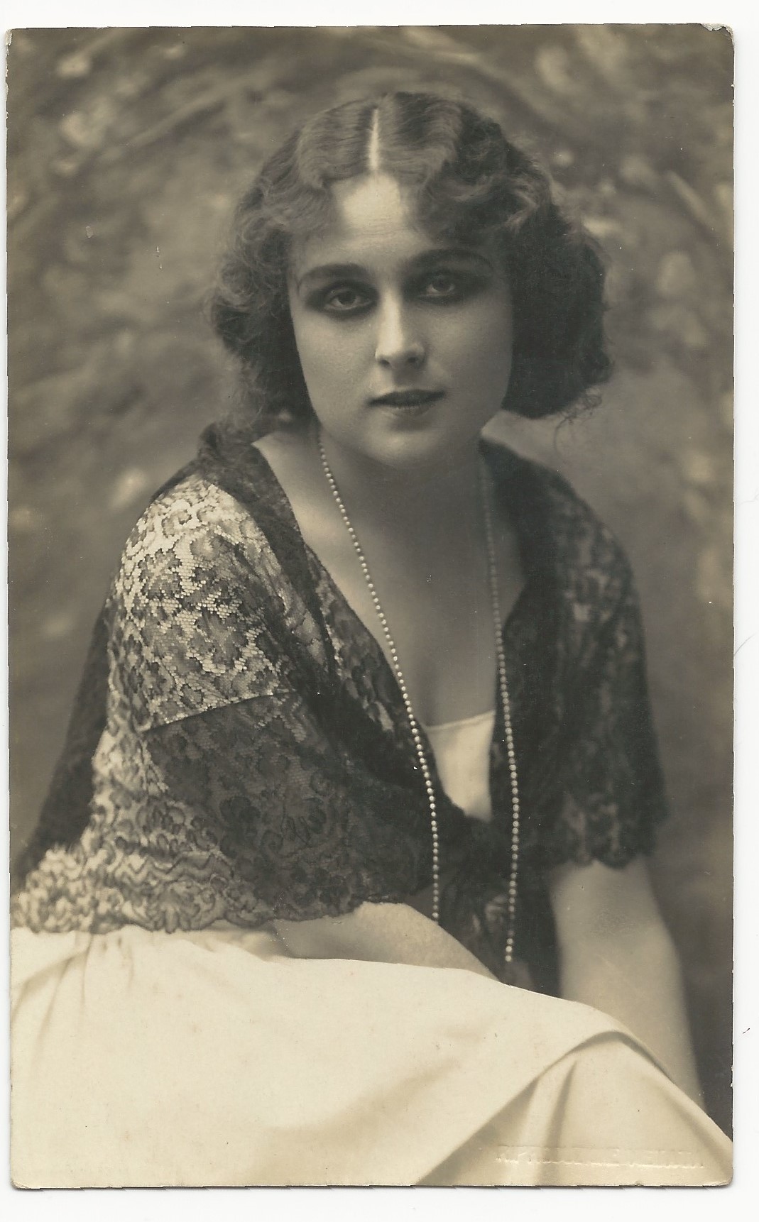 The pretty costumed blonde actress featured in this real photo postcard is Edy Vayland. She is wearing a fantastic headdress. This portrait is a bit risque for it’s era. Preliminary research revealed little information about this Belle Epoque theatre actress. One source labelled her a burlesque actress. The postcard is from the 1910’s and was published in Italy by A. Traldi from the city of Milan. Traldi operated in Milan from 1902-1918. The publisher concentrated on view cards of Europe and the Middle East. They are also known for a series published that focused on dogs. Research reveals that they produced a number of postcard portraits of European stage performers. Miss Vayland’s photograph was taken by the Badodi studio in Milan. This real photo postcard portrait is in excellent condition (see scans). SOLD