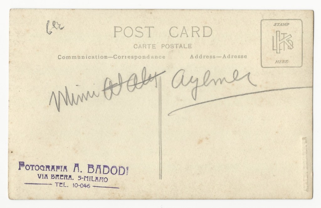 This vintage real photo postcard features Italian stage and film actress, Mimi Aylmer (also spelled Almieri) (1896-1992). She was a star during Italy’s fascist era. Aylmer was born in Rome. Her family was of the bourgeois class. At age seventeen, she made her debut as a chanteuse (female nightclub singer of popular songs). Shortly after her debut, she was hired by the Riviste Papa stage company. In 1914, she launched her film career. She starred in her first film and remained a major star for more than twenty years (until 1936). After World War II, she played character roles in two films before retiring from the entertainment world in 1959. In 1964, she moved to Bologna where she lived in a rest home for entertainment artists. The IMDb reports that Aylmer has twelve film credits ranging from 1914 to 1951. As this photo postcard demonstrates; Miss Aylmer was a pretty woman. She has an aura of sweetness and a nice half smile. This vintage postcard is in very good condition (see scans).The reverse of the card has the stamp of Milan photographer Attilio Badodi (1880-1967). He was a talented and very successful photographer of European celebrities. His photos immortalized many actors and actresses. He also did portraits of Benito Mussolini. The stamp box on this postcard indicates that it was published by K Ltd. sometime between 1918 and 1936. The postcard is in good condition (see scans).