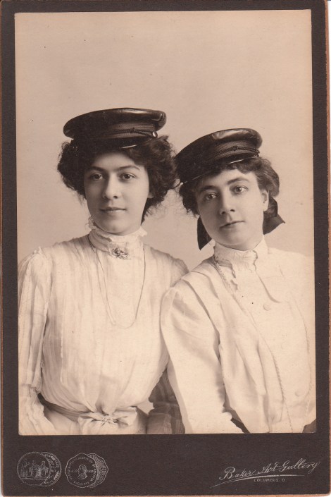 This cabinet card features two attractive young women, obviously sisters, posing in white clothing and wearing dark leather caps. What is the story concerning the caps? The headwear is certainly quite unusual to be seen in a photograph from this era. Are the caps part of an occupational uniform? One wonders if the caps are driving caps, but the automobile was likely not around all that long when this photograph was taken. Any theories about the hats would be welcome from cabinet card gallery visitors. Please leave a comment with your theories. This cabinet card was photographed by the Baker Art Gallery of Columbus, Ohio. To learn more about the gallery and to view other photographs by the Baker’s, click on the category “Photographer: Baker Art Gallery”.