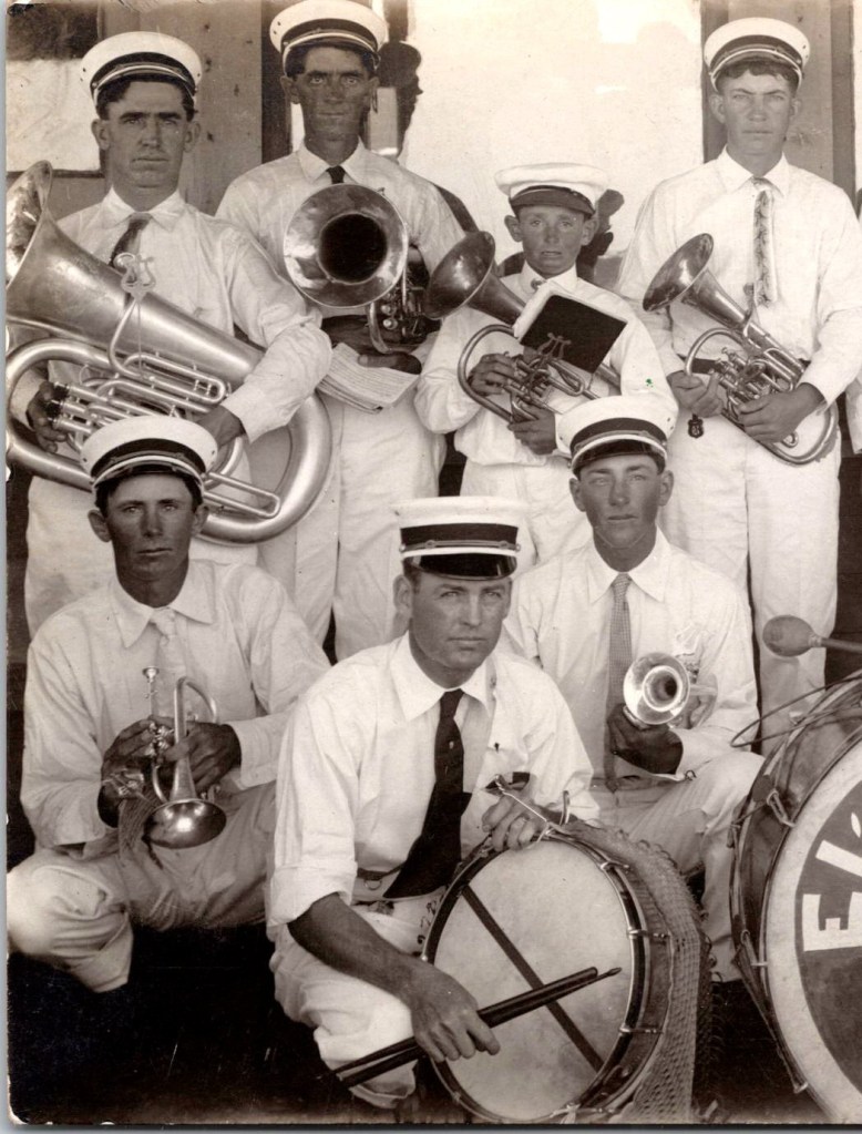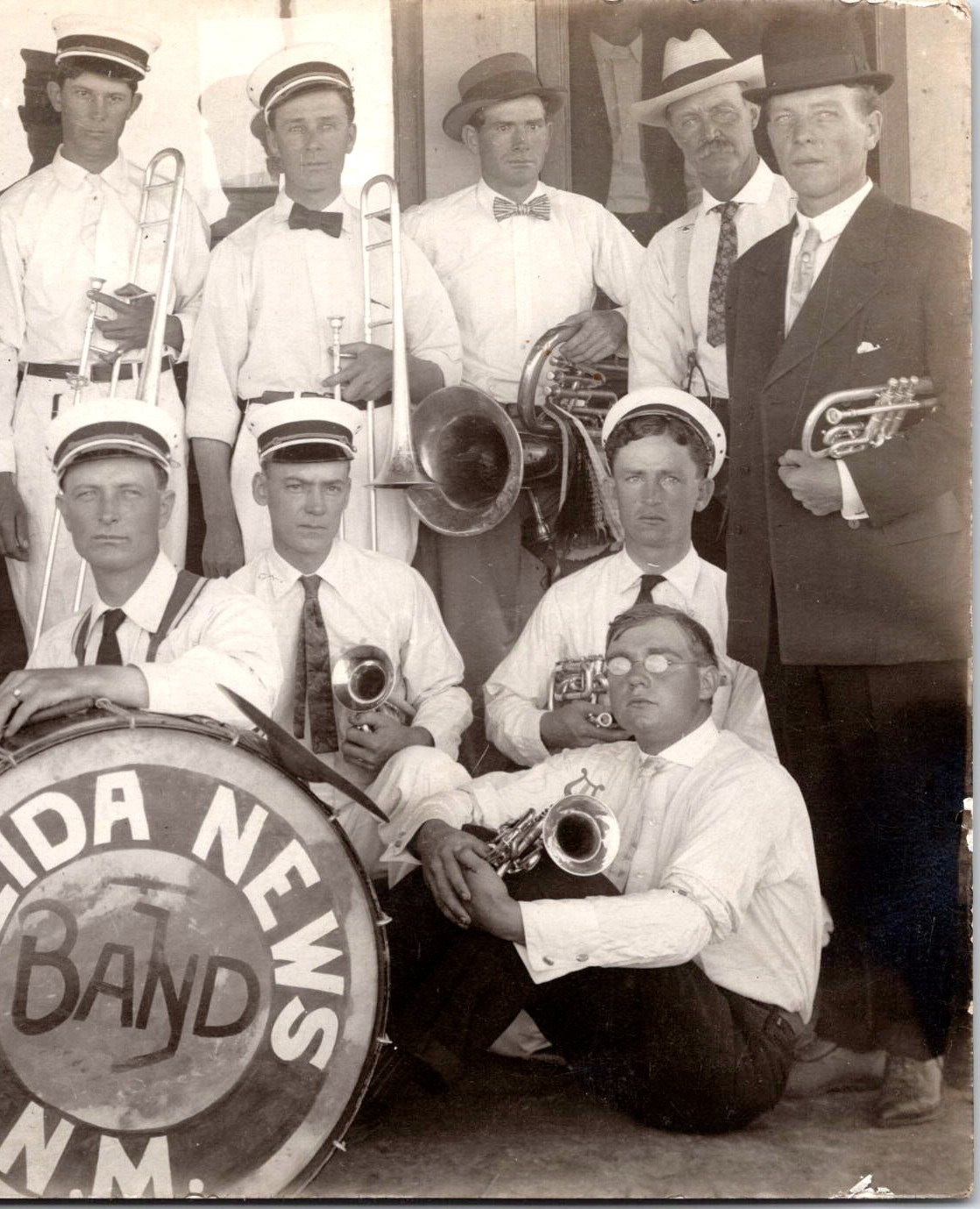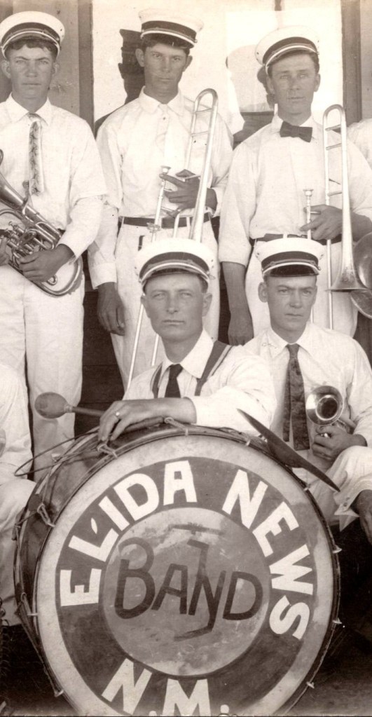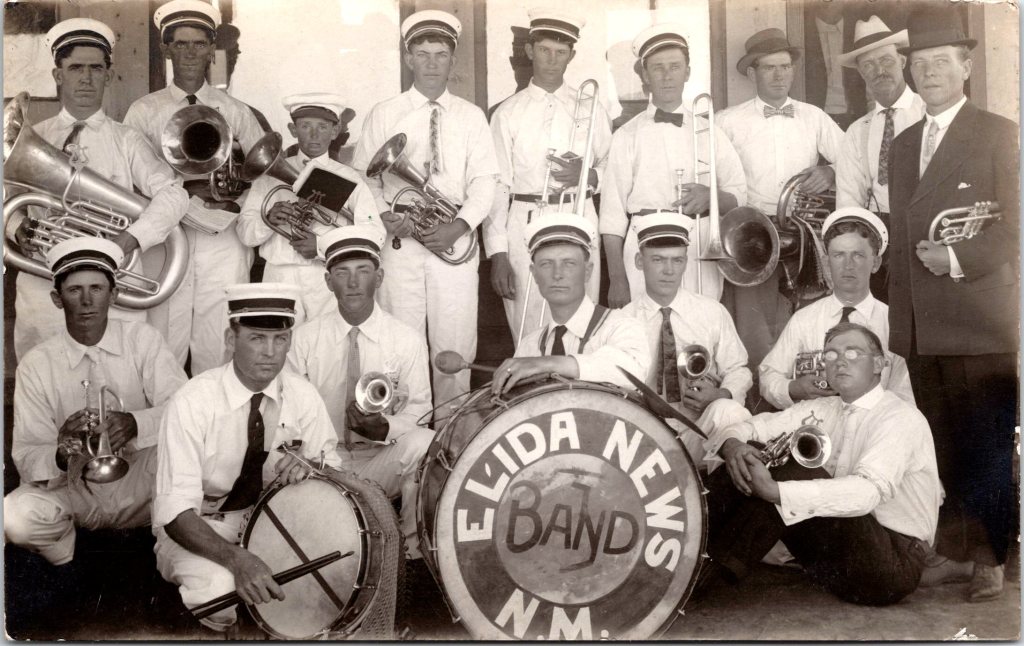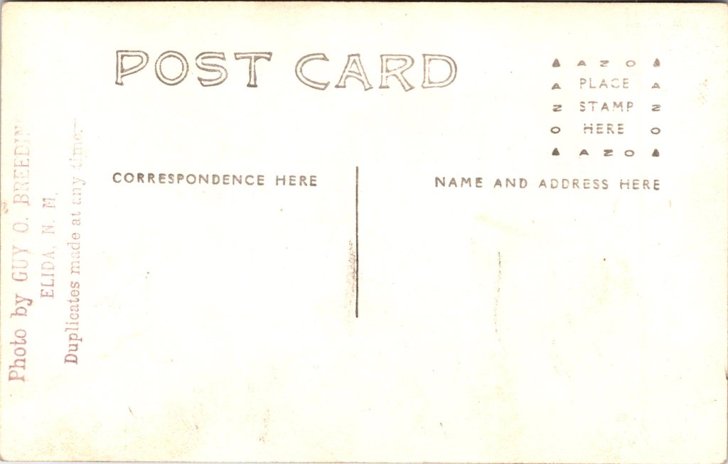 This striking real photo postcard (RPPC) captures a moment in early 20th-century New Mexico history with a beautifully composed group portrait of the Elida News Band from Elida, N.M. The band members are posed proudly in their crisp white uniforms and hats, each holding an instrument—cornets, trombones, tubas, drums, and other brass band staples. The large bass drum in the foreground is boldly labeled “Elida News Band N.M.” giving clear identification to this historic ensemble. The image is full of character, with each musician presenting a distinct expression, from serious and stoic to modestly smiling. Of special note are the two men in suits standing at the far right—possibly the band director and a community official—adding to the formality and significance of the occasion. The reverse of the postcard is marked AZO with four triangles pointed upward, dating it to approximately 1904–1918. Since the postcard has a divided back, it is likely that the postcard was actually published between 1907 and 1918. Along the left margin is the credit: “Photo by GUY O. BREEDING, ELIDA, N.M.”. Elida is a small village situated in Roosevelt County, eastern New Mexico. The closest major city to Elida, New Mexico is Lubbock, Texas, located approximately 100 miles east of Elida. (SOLD)