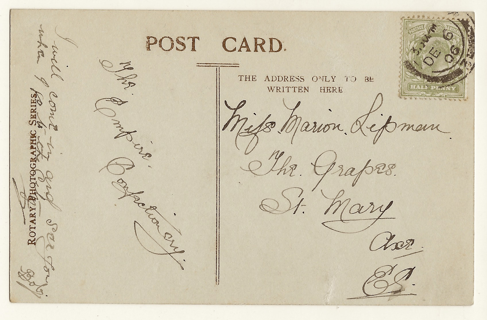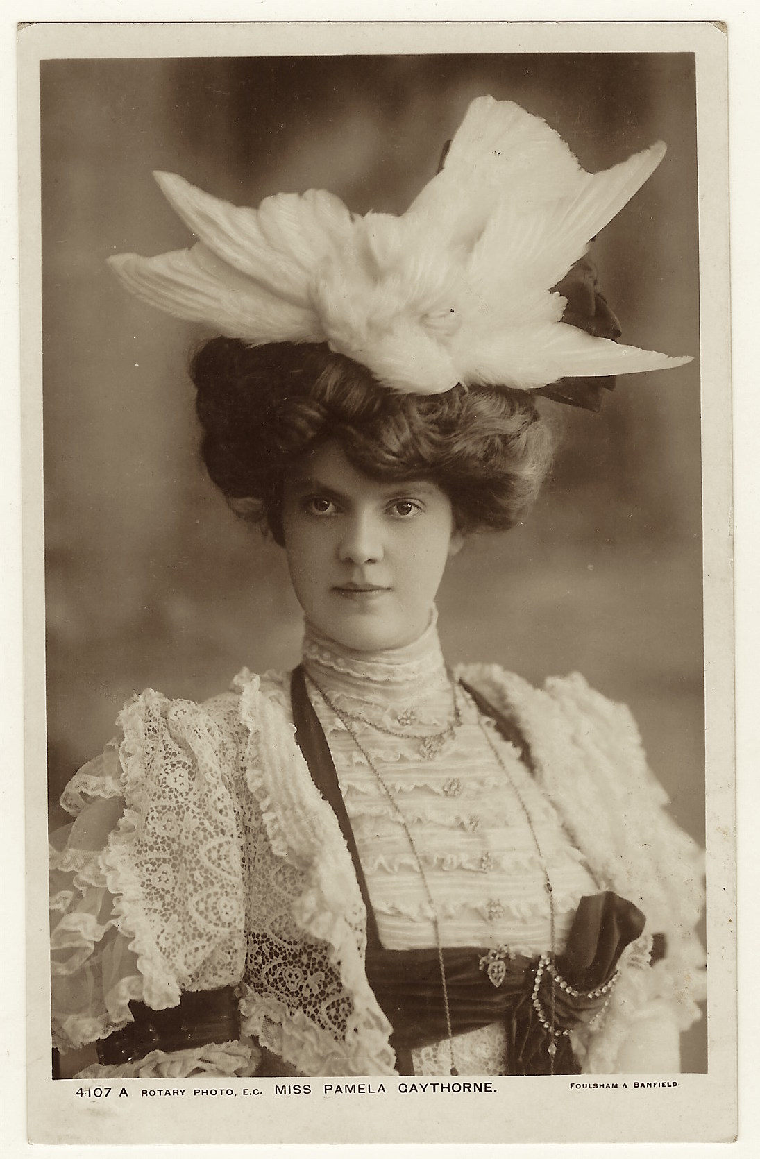 This vintage real photo postcard features English stage actress Pamela Gaythorne. She is quite attractive and wearing much jewelry and lace. Note her not so subtle hat. It looks as if a seagull is resting on her head.  Miss Gaythorne is captured in this image as she appeared in “The Fascinating Mr. Vanderveldt. She appeared in this theatre production with Violet Vanbrugh and Arthur Bourchier. The IBDB reveals that Miss Gaythorne appeared in, and often starred in, 12 Broadway productions. Her Broadway career spanned from “Keeping Up Appearances” (1910) through “This Fine-Pretty World” (1923). The New York Times (2/14/1911) reviewed a play named “Nobody’s Daughter”. Gaythorne appeared in this play and in writing about her, the reviewer wrote that he “heartily commends” her performance. The article adds that she played her character with “delightful spontaneity, charm, variety, and suggested youth and spirit, while touching the more sentimental passages with manifest sincerity”. The photographers of this image was Foulsham and Banfield, a prolific celebrity postcard portrait studio. The postcard was produced by Rotary Photo and is part of a series (no. 4107 A). The message on this card is from Bob to Miss Marion Lipman and states “I will come in and see you when I go to the city”. Also written in the message section is what appears to be “The Empire Confectionary”. Perhaps a Cabinet Card Gallery visitor can throw some illumination on that term and also ascertain what nation the stamp of this postcard represents. The postcard is postmarked 1906.