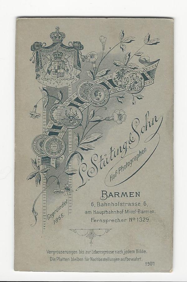 A lovely couple poses for their portrait at the Stuting and Sohn studio in Barmen, Germany. The man and woman are well dressed. The man is holding reading material on his lap. One of the more remarkable aspects of this image is the gentleman’s interesting mustache. The mustache is bushy and curls wonderfully at each end. The photographer, Stuting, is cited in two photographic journals published in 1890 (American Journal of Photography, The Photographic News). Stuting’s studio was located in Barmen, which merged with four other towns in 1929 to form the city of Wuppertal. Barmen is also known as the birthplace of socialist theorist Friedrich Engels. Finding a photographer in Barmen at the turn of the century must not have been much of a problem. The Cabinet Card Gallery has a number of carte de visite photographs originating from studios in Barmen. Printed on the lower right hand corner of the reverse of this cdv is the number “1907”. This likely represents the date that this photograph was taken despite the fact that most photographers stopped producing carte de visite photographs by that date.