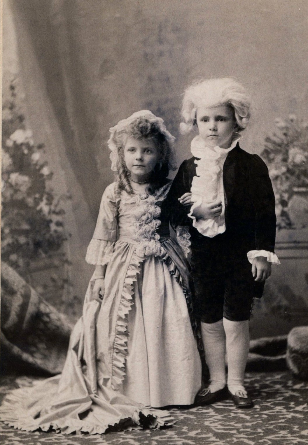 This vintage real photo postcard features two children posing as a bride and groom. The bride looks beautiful in her wedding dress and the groom is adorable in his tuxedo and top hat. Obviously, this is not a real wedding photo. However, it is likely an example of a Tom Thumb Wedding portrait. “Tom Thumb Weddings” were inspired by the marriage of little people, Charles Stratton and Lavinia Warren. The couple were both working as attractions for P. T. Barnum, of circus fame. Stratton was known as General Tom Thumb. The pair were married in 1863 and the wedding was a lavish affair. People were fascinated by the couple’s wedding and reception. The event was called “The Greatest Little Wedding” and people became so obsessed that they began to create their own “miniature weddings”. At these weddings, the bride, groom, and bridal party were composed of young children. These weddings were run like plays and often money raised at these events were used for charitable purposes. This postcard photograph may be from one of these Tom Thumb weddings but I can not be certain.The previous owner of this postcard, a postcard maven, described this postcard as being from Germany and as being published around 1909. I can not substantiate that “Tom Thumb Weddings” took place in Germany. To view other “Tom Thumb Wedding” photographs, click on the category “Tom Thumb Wedding Portraits”. (SOLD)