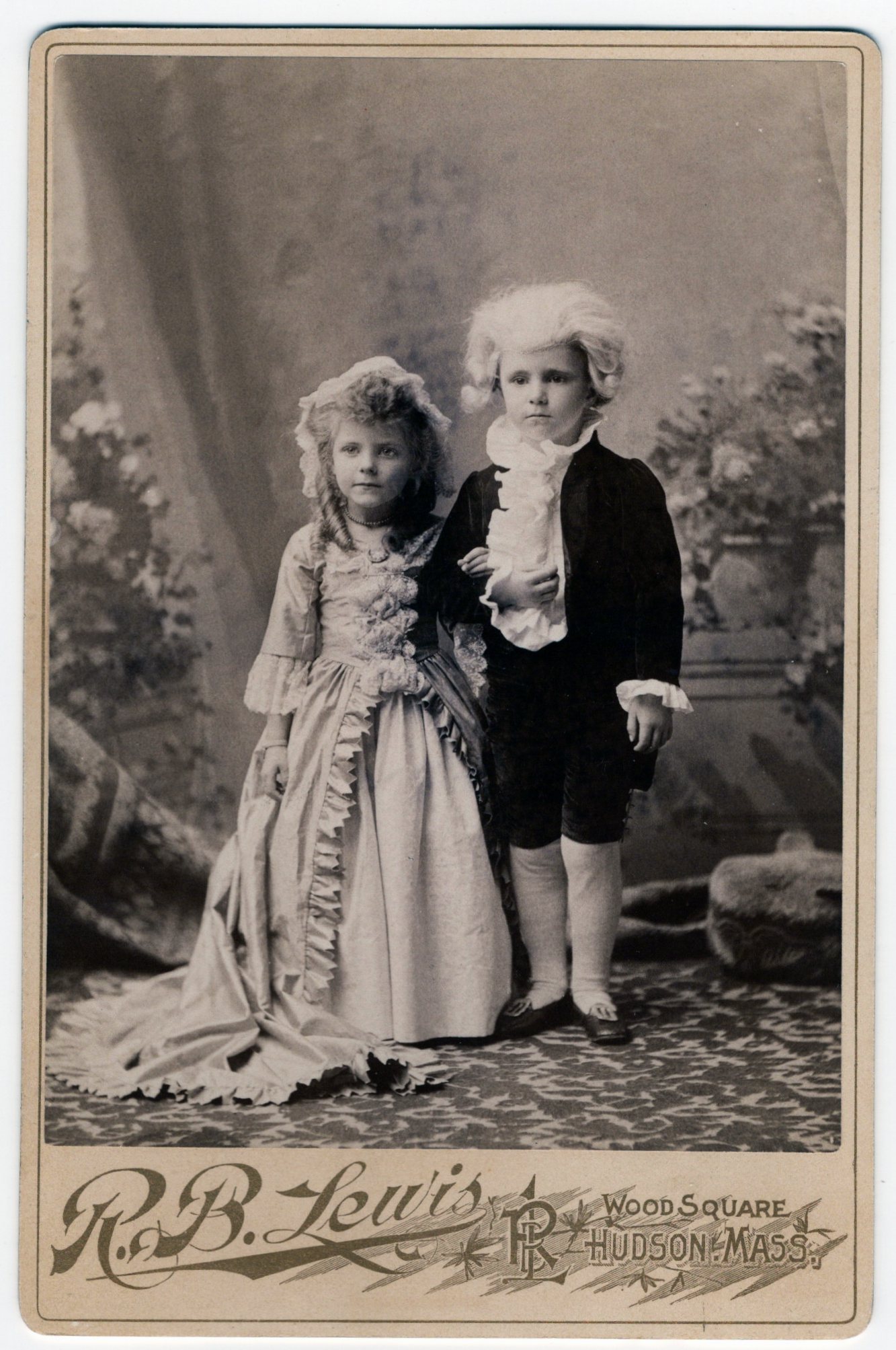 This cabinet card poses an interesting question. My first impression upon looking at the photograph was that it was an example of a “Tom Thumb Wedding Portrait”. What is a “Tom Thumb Wedding” ? The answer offers an interesting social commentary. A “Tom Thumb Wedding” is a wedding pageant in which the major wedding roles are played by children; usually under ten years old. Not only are the bride and groom portrayed, but so are the best man, maid of honor, groomsmen, bridesmaids and the clergyman. Some of these weddings involved more then twenty children playing costumed parts. Often times, the weddings were fund raising events for charitable causes. These faux weddings became popular after the wedding of General Tom Thumb (Charles Stratton) to Lavinia Warren in 1863. Tom Thumb’s wedding was very publicized by the media in America and received the attention across the county. Not having any royal families, Americans had to find celebrities to obsess over. Tom Thumb had a great promoter keeping him in the public’s eye. P. T. Barnum, the circus entrepreneur managed Tom Thumbs career. The previous owner of this cabinet card contends that this image is actually a portrait of a boy and a girl portraying George and Martha Washington. I have to give the last owner’s theory credibility because over the years I have been collecting these photographs, I have seen a number of portraits of children portraying George and Martha. Sometimes the images present them together and sometimes separately. In conclusion, there is no conclusion. What do you think, “Tom Thumb Wedding” or “Portrayal of George and Martha Washington”. The photographer of this image is R. B. Lewis of Hudson, Massachusetts. He is cited in the Photographic Journal of America (1893) for an excellent photograph of a football team. Lewis is also listed in the Hudson city directory as a photographer between at least 1872 and 1909. This cabinet card portrait has gold beveled edges and is in excellent condition (see scans).