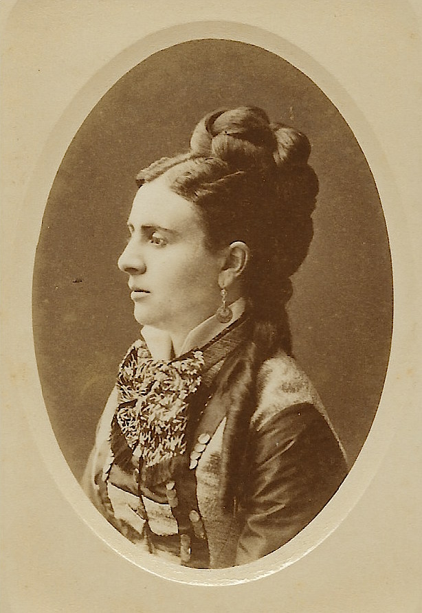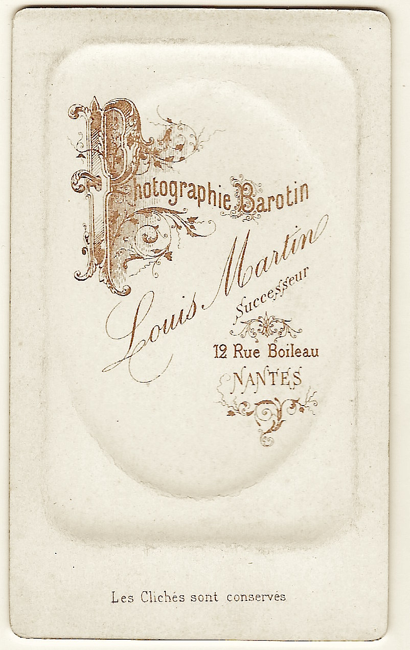 This cartes de visite portrait features a woman posing for photographer, Louis Martin of Nantes, France. This profile view shows a well dressed and well coiffed subject. The cdv is an example of a bas relief photo (raised image providing a 3 dimensional effect). photograph. Nantes is a city on the Loire River and is located in the Upper Brittany region of western France. This photograph is in very good condition. (see scans).